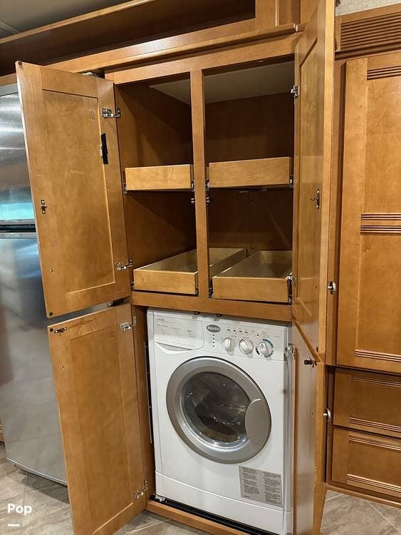 The living space offers a sofa sleeper, recliner, dinette, flat-screen TV, and fireplace for relaxing evenings. Washer/dryer combo unit included!