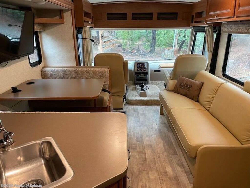 The spacious interior has vinyl flooring throughout for easier cleaning, LED lighting, sofa, a booth style dinette with underneath storage, MCD shades, HDTV, a drivers compartment with full instrumentation including remote mirrors, rear-side view monitoring system, co-pilot work station with a center and a removable table.The galley is fully equipped with beautiful cabinetry, 3 burner LP range with oven, microwave, double sinks, custom tile back splash, a 2 door refrigerator, pantry with sliding shelves and a handy entrance closet.