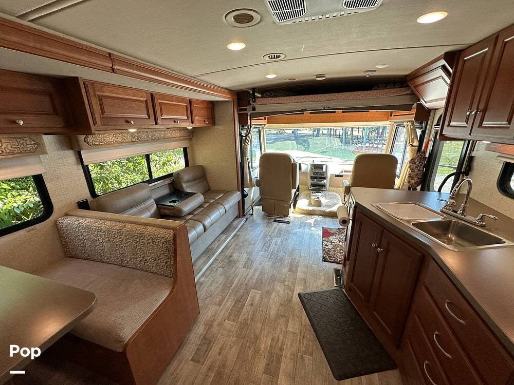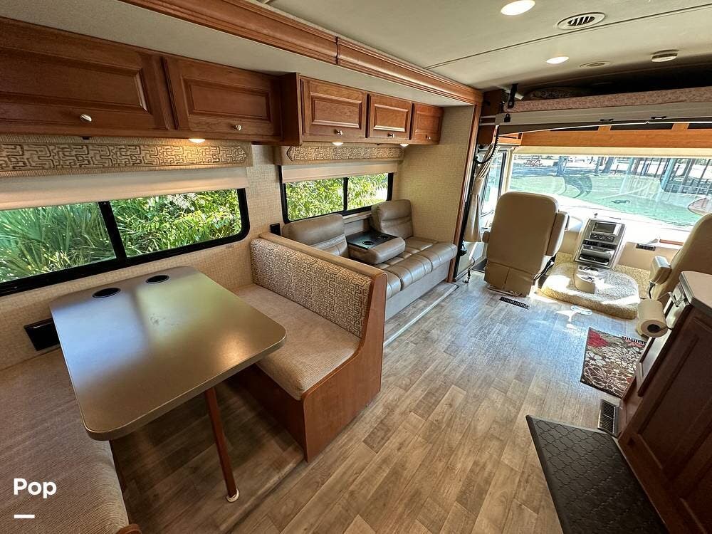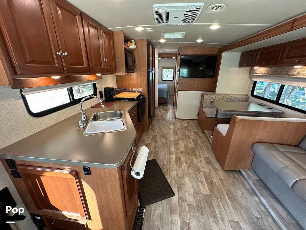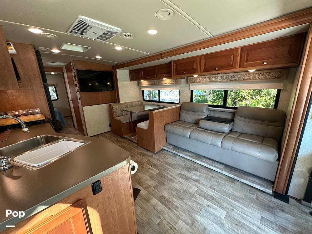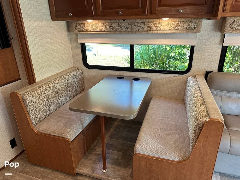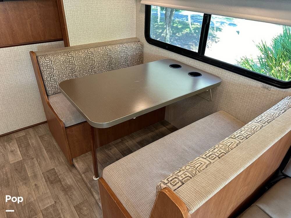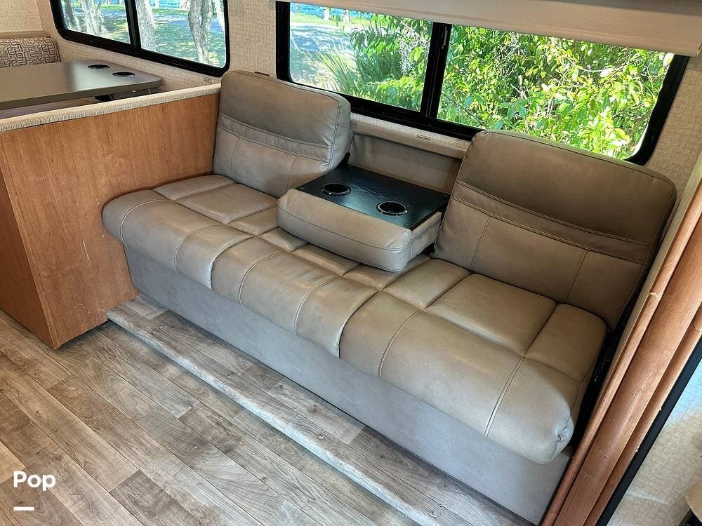 It has a spacious living area with an open floor plan and large slide-outs; you have plenty of room to relax or entertain. The dinette and sofa provide comfortable seating with ample storage space throughout.