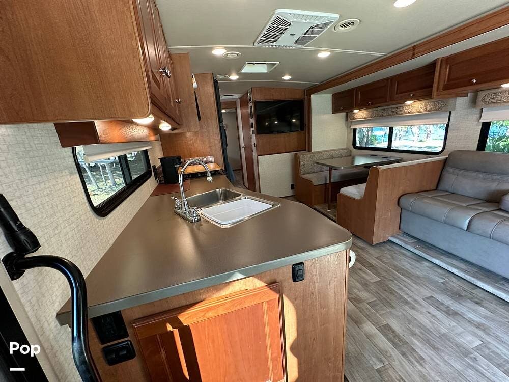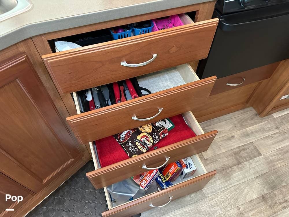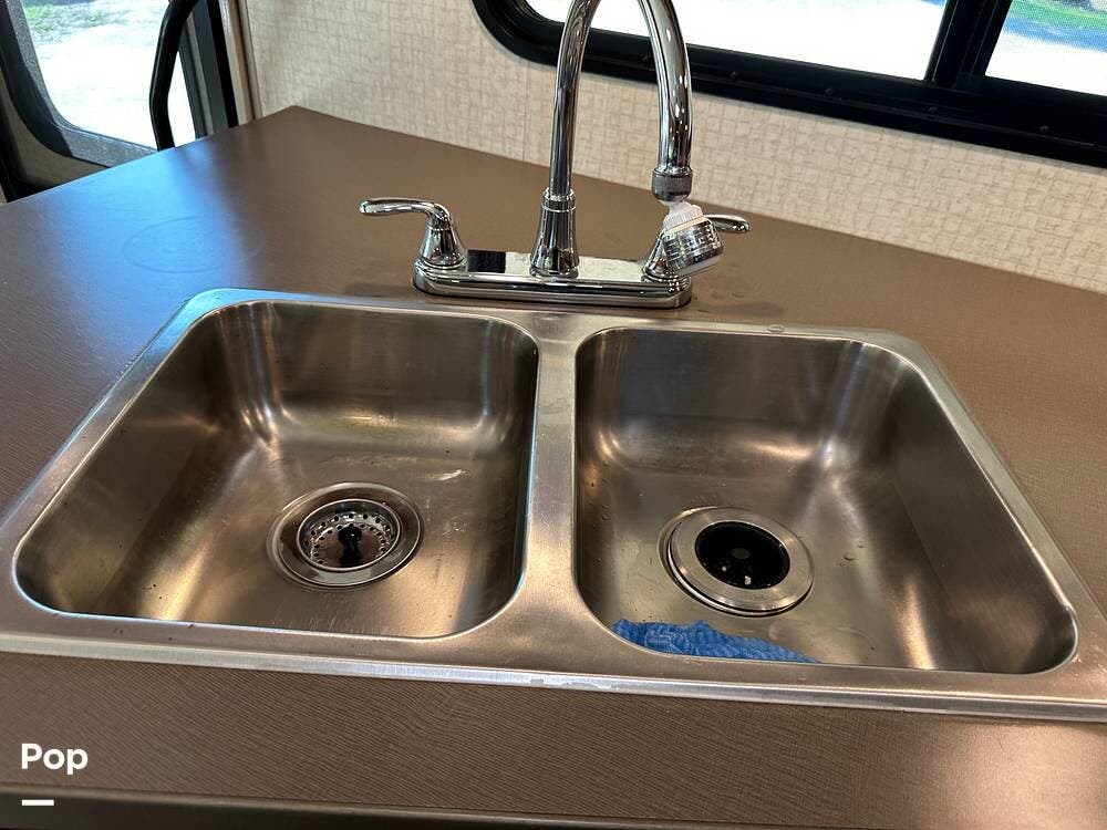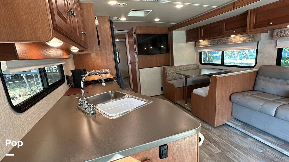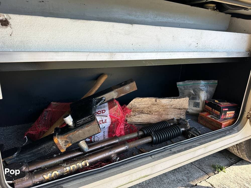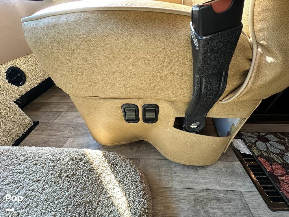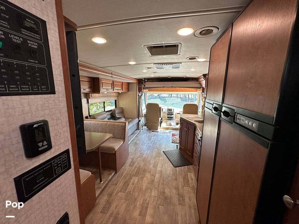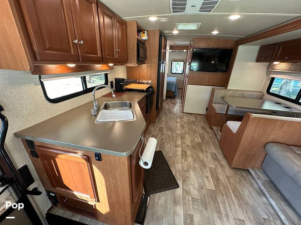 It has a spacious living area with an open floor plan and large slide-outs; you have plenty of room to relax or entertain. The dinette and sofa provide comfortable seating with ample storage space throughout.