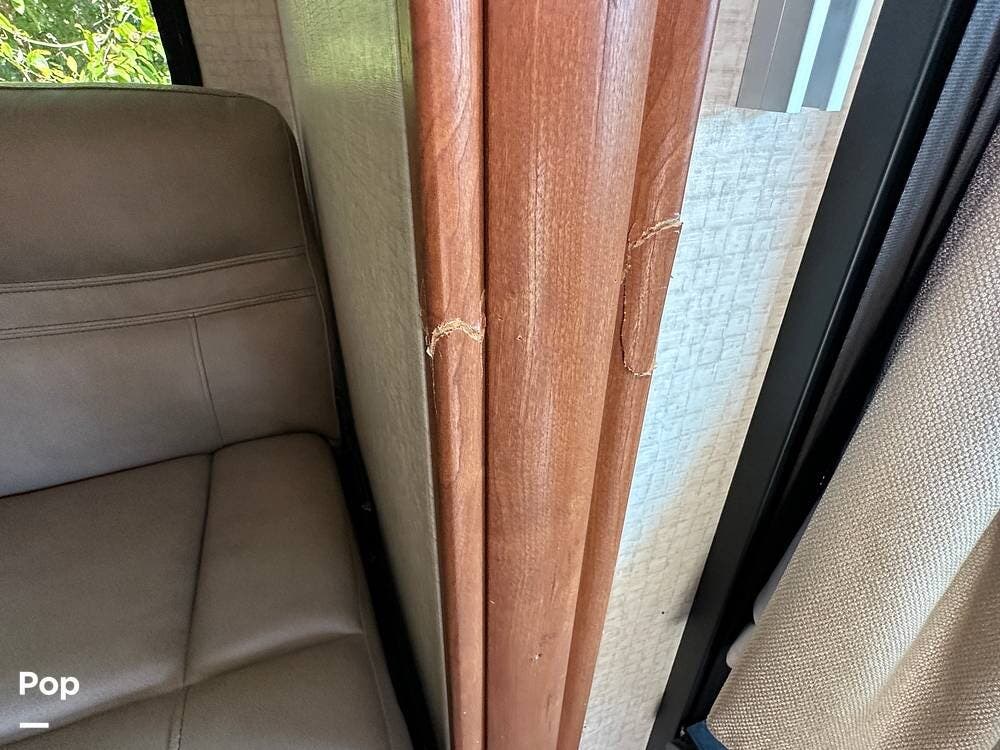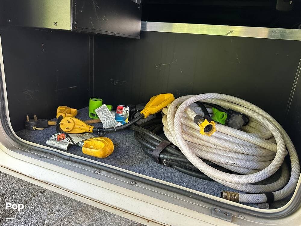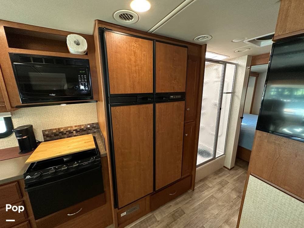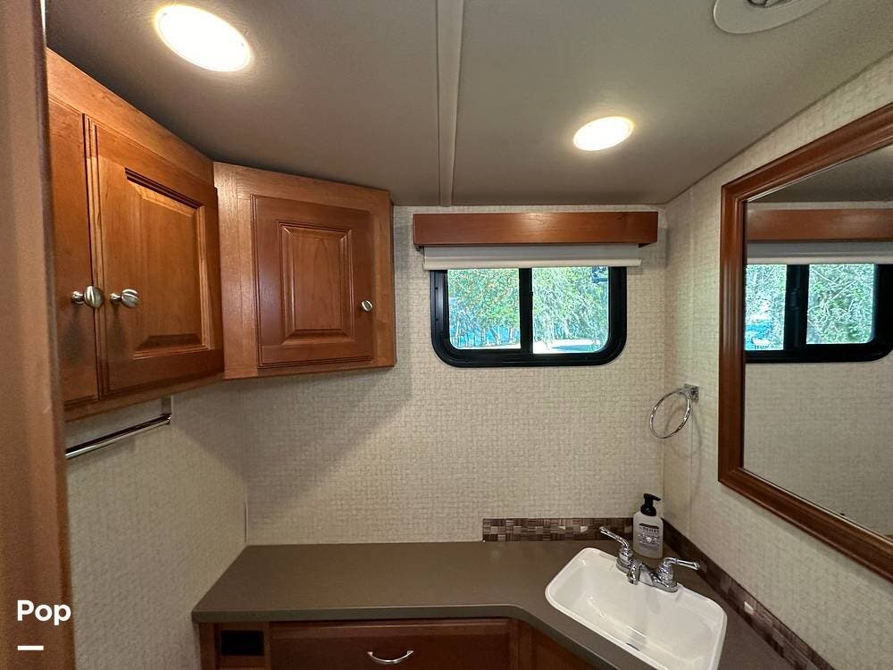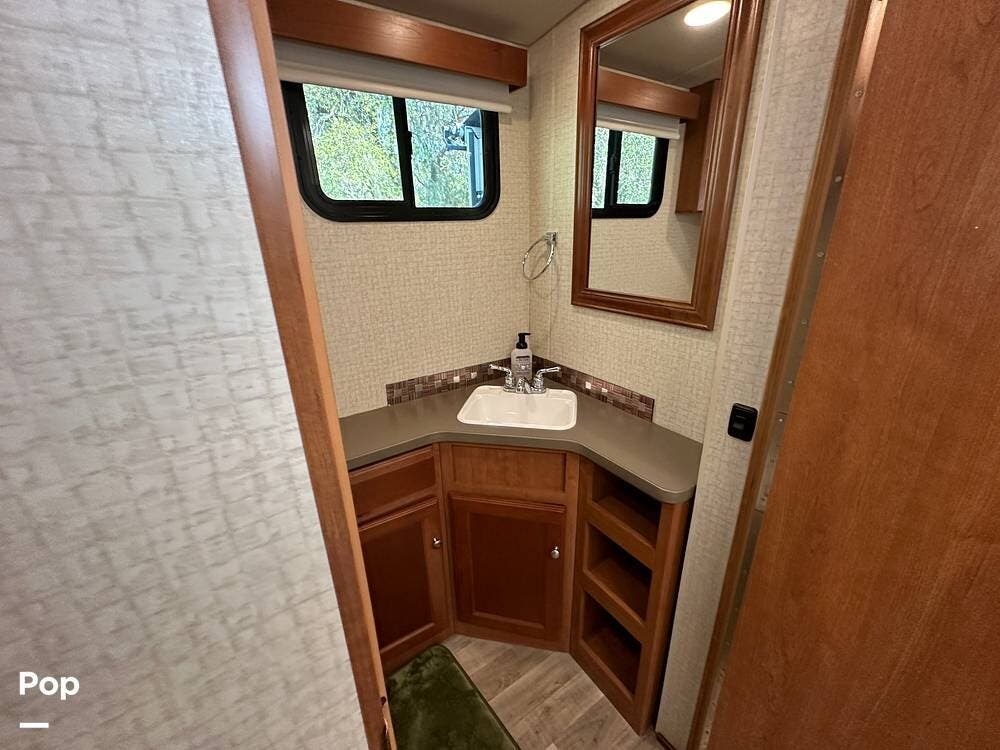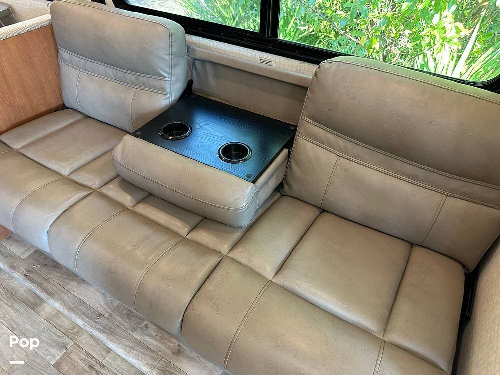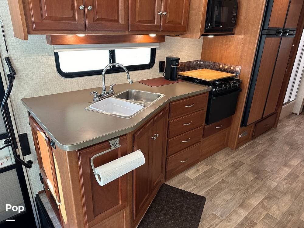 It has a spacious living area with an open floor plan and large slide-outs; you have plenty of room to relax or entertain. The dinette and sofa provide comfortable seating with ample storage space throughout.