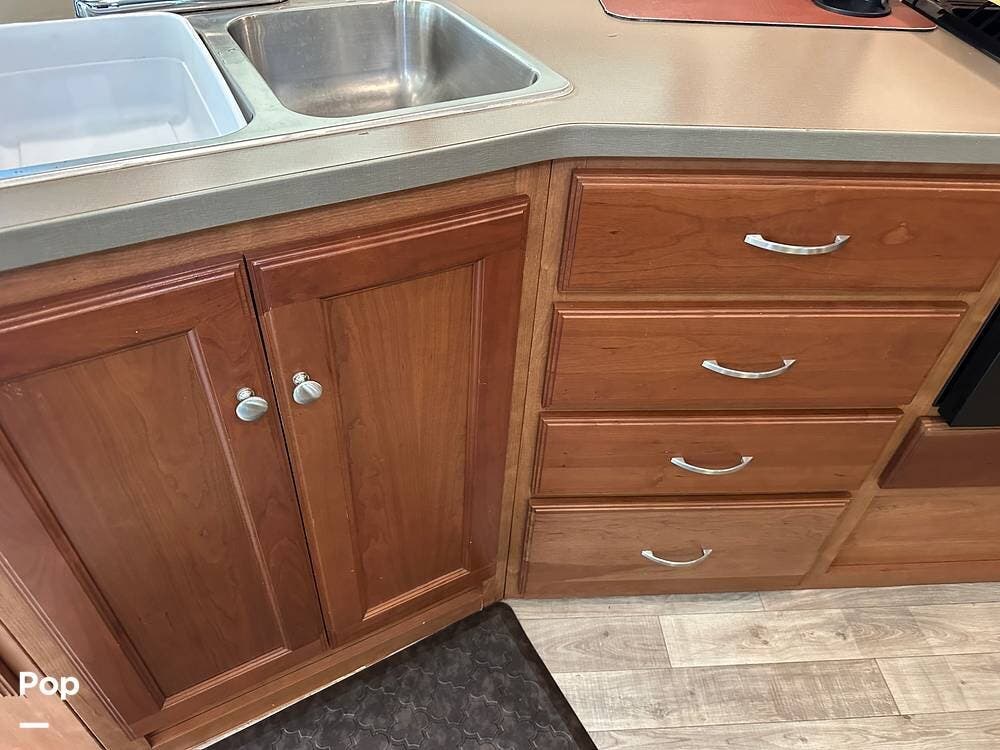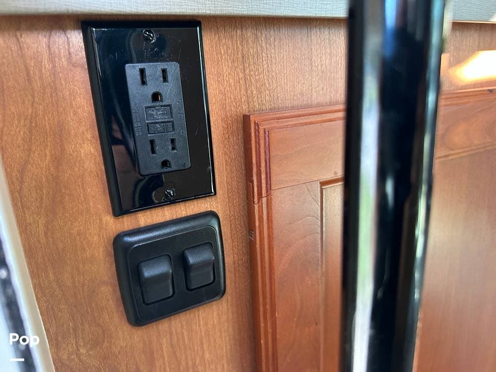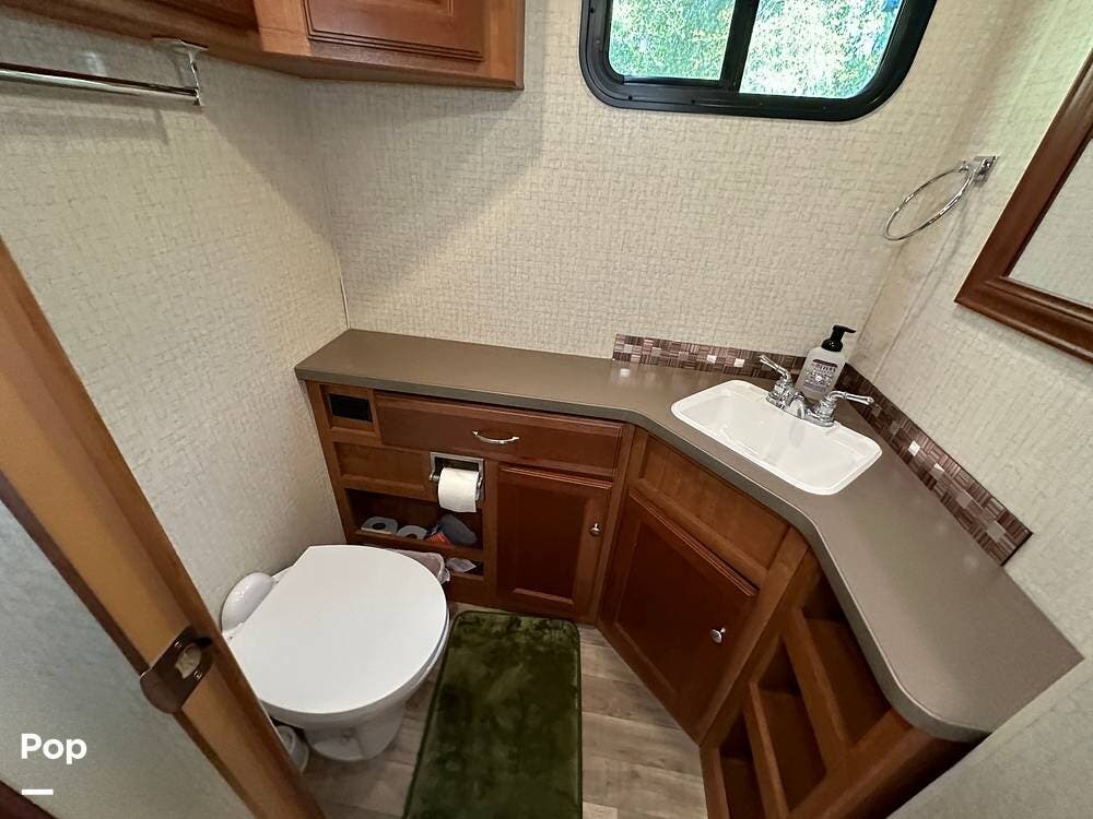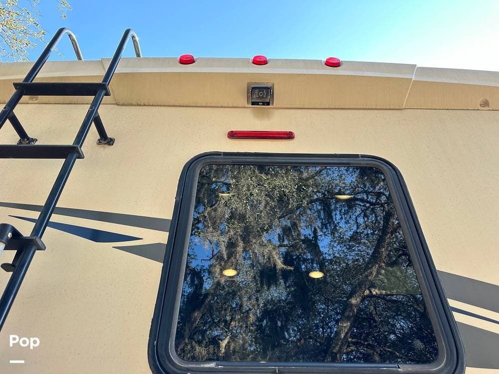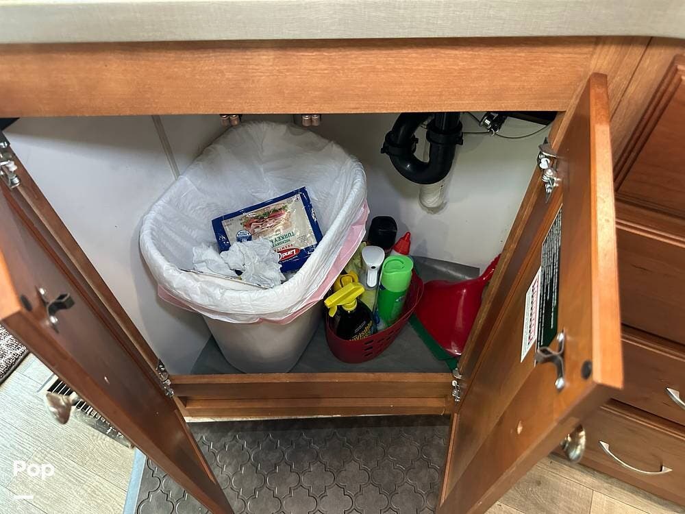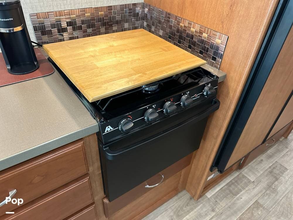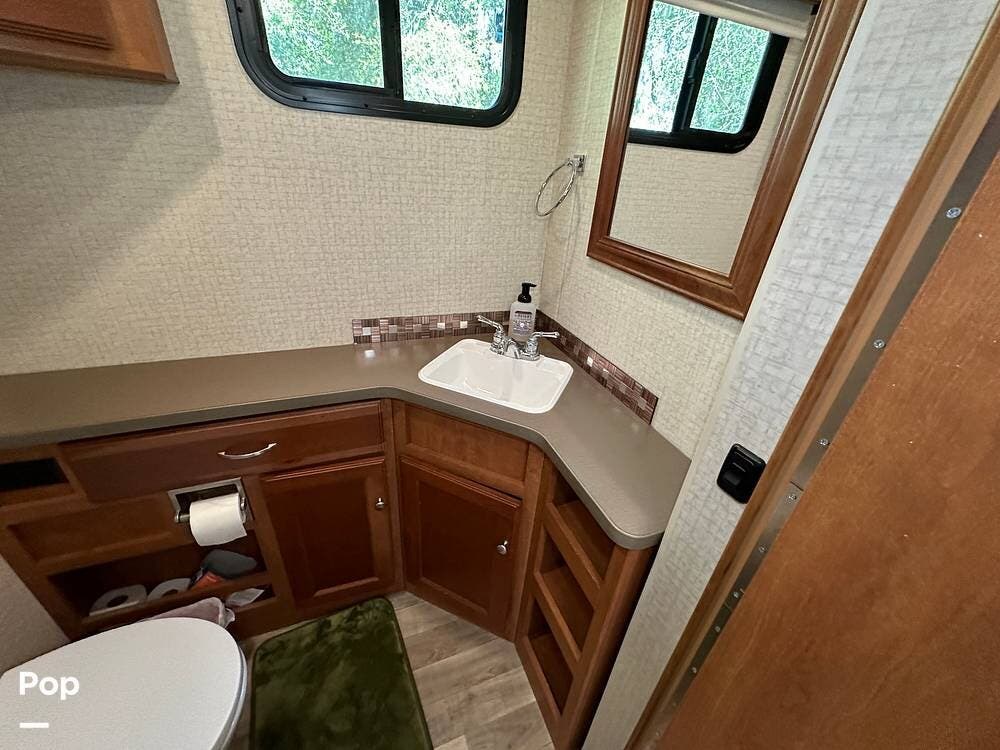 It has a spacious living area with an open floor plan and large slide-outs; you have plenty of room to relax or entertain. The dinette and sofa provide comfortable seating with ample storage space throughout.