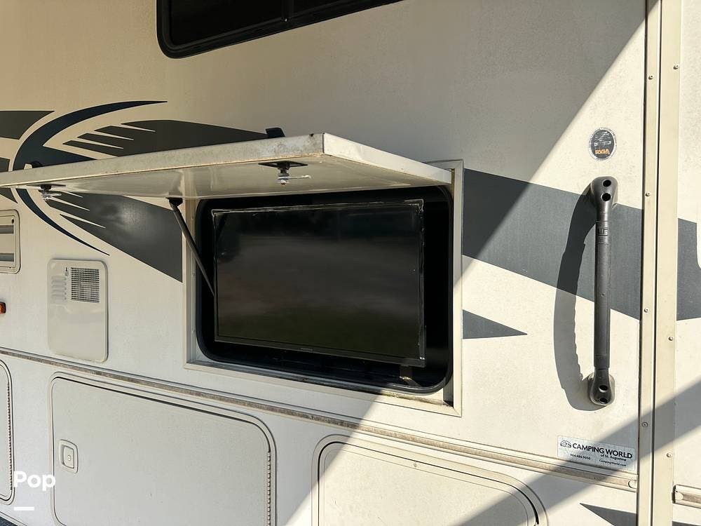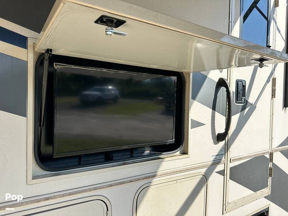 Enjoy outdoor living under the electric-powered awning, which has built-in LED lighting and an outside flat-screen TV, perfect for evenings by the campfire.