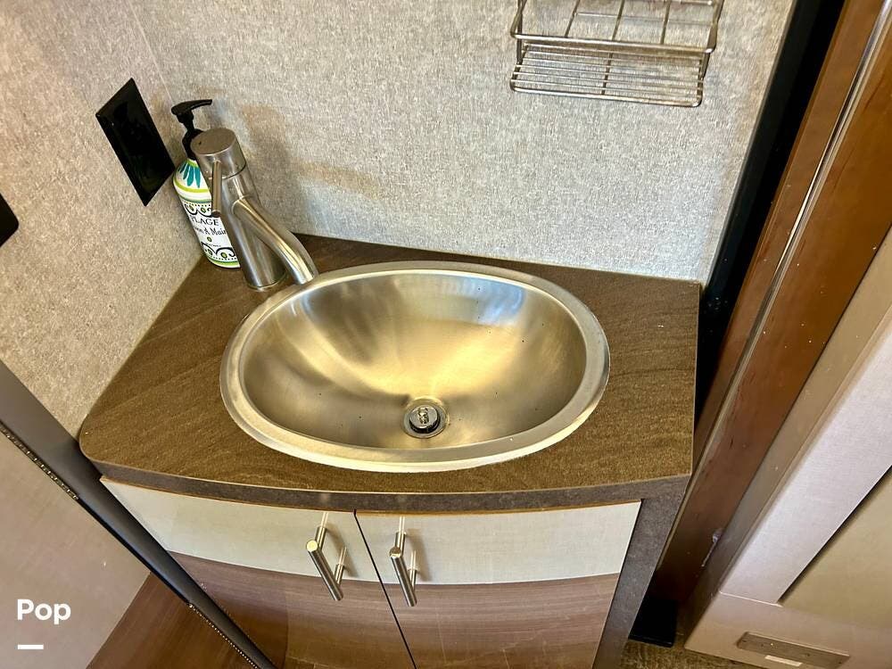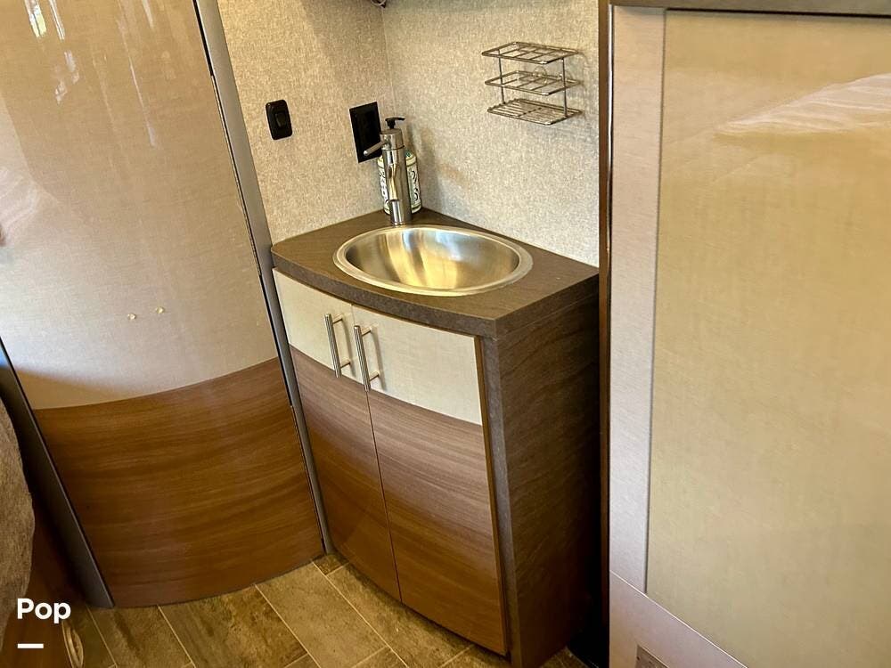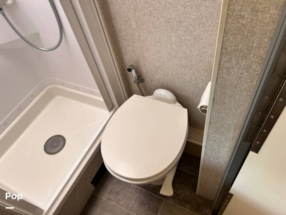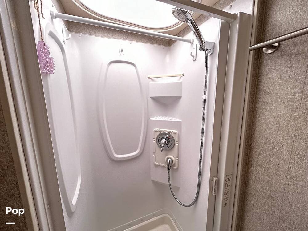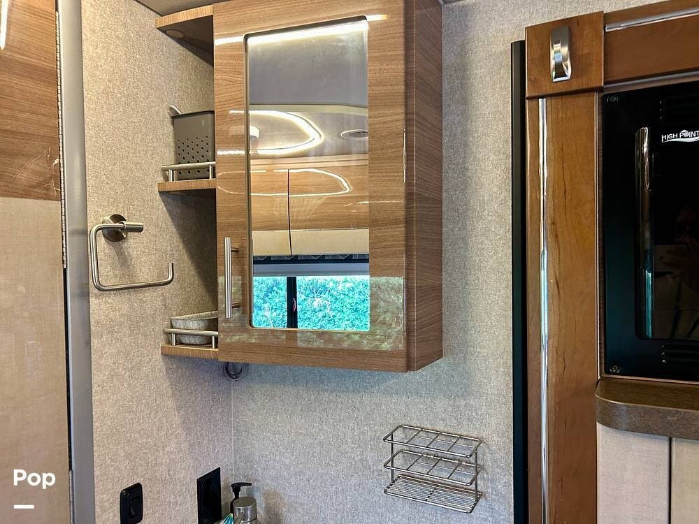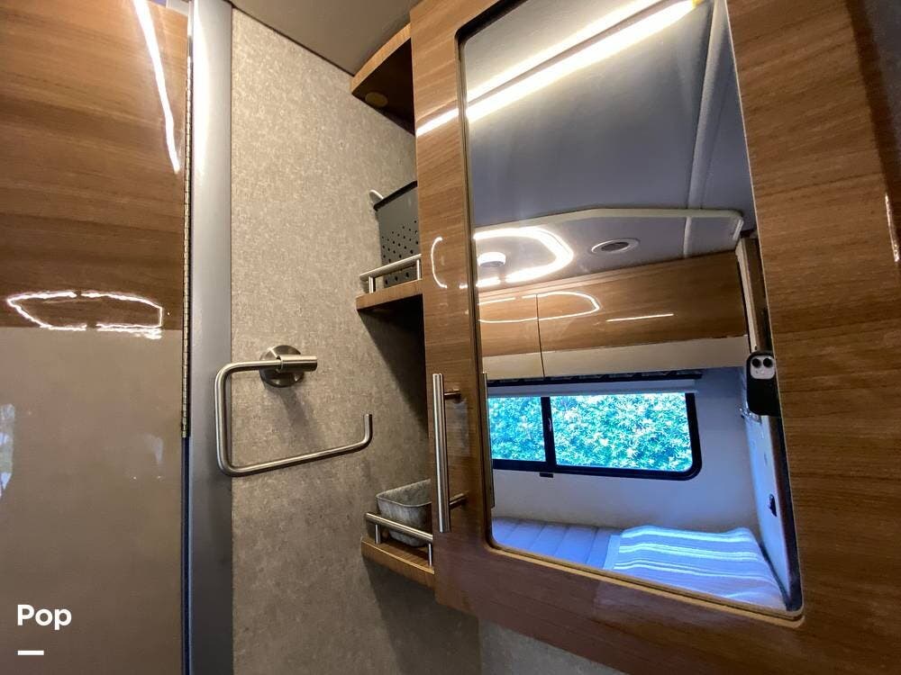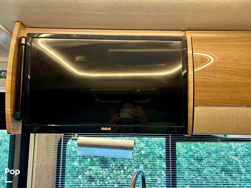 The compact bathroom is well equipped, and two TVs (one not pictured) provide onboard entertainment. For off-grid adventures, this coach comes with a specialized generator and solar panels to keep you powered wherever the road takes you.