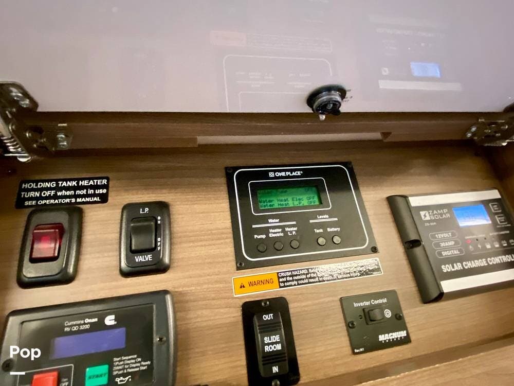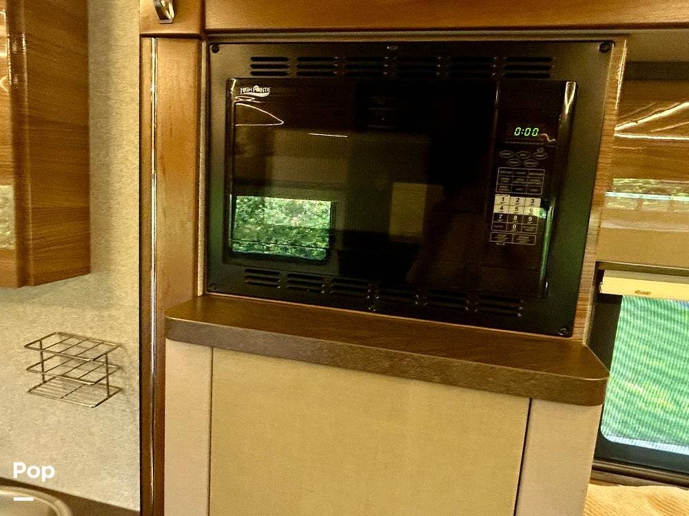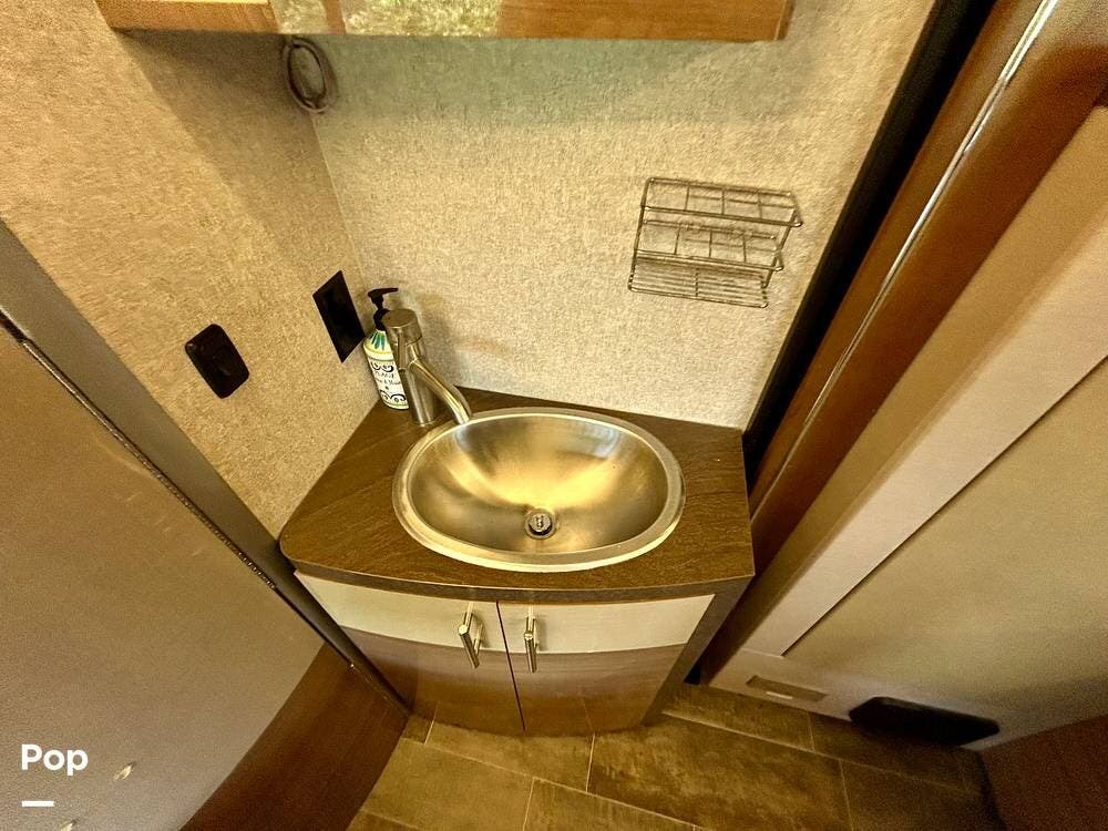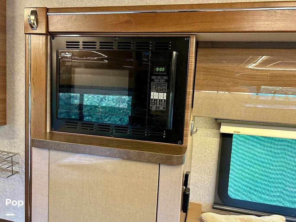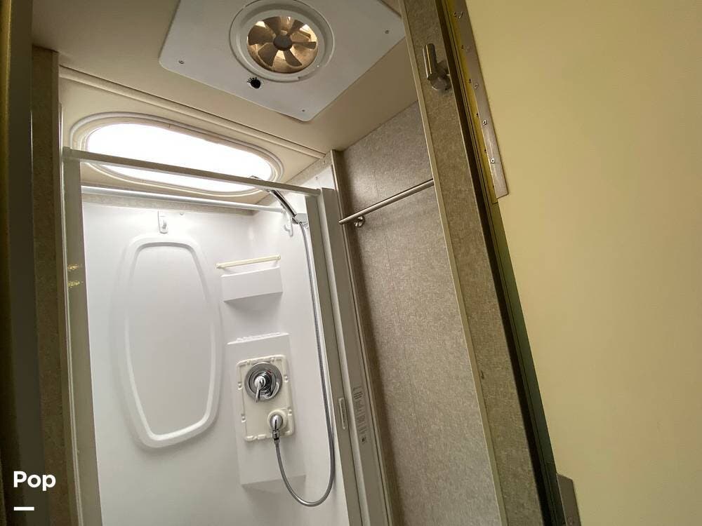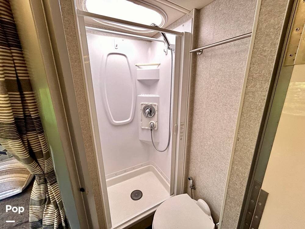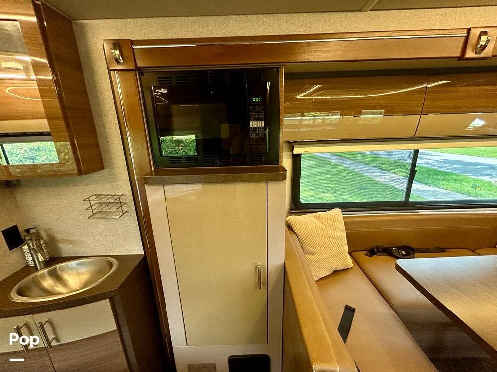 The compact bathroom is well equipped, and two TVs (one not pictured) provide onboard entertainment. For off-grid adventures, this coach comes with a specialized generator and solar panels to keep you powered wherever the road takes you.
