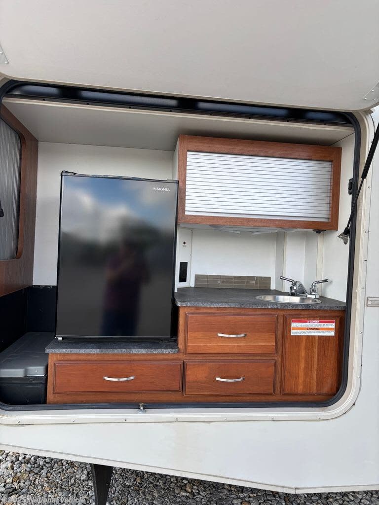 Full outdoor kitchen: mini fridge, sink, cabinet, cutting board, LP connection with camp stove