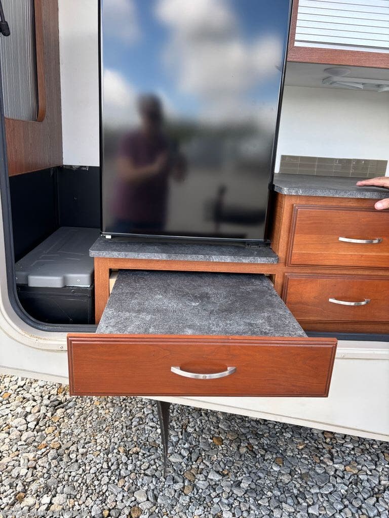 Entertainment: TV in living room, TV in bedroom, outdoor TV in entertainment center, Winegard antenna, radio with indoor/outdoor speakers