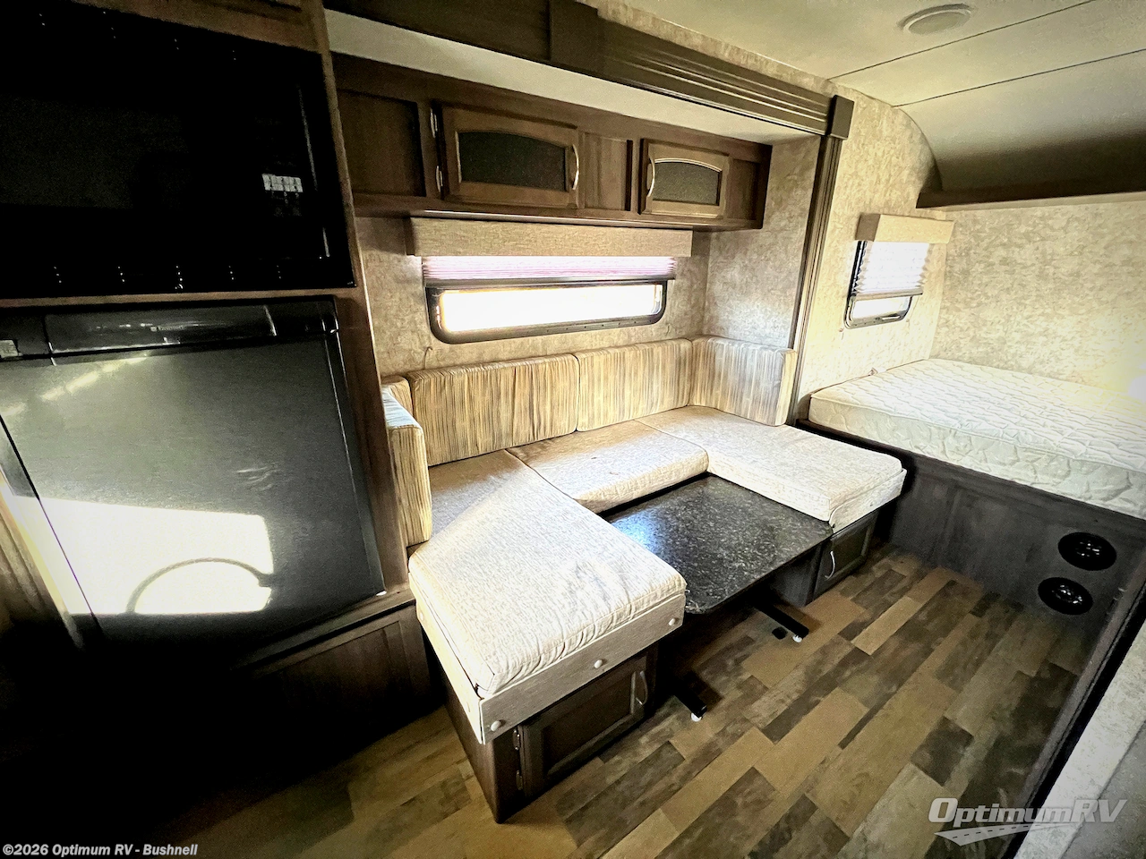 Along the road side wall you will find a refrigerator and a u-shaped dinette slide out. The dinette is 44" x 75" with storage space in upper cabinets, and it can also be transformed easily into a bed for sleeping if needed at night.