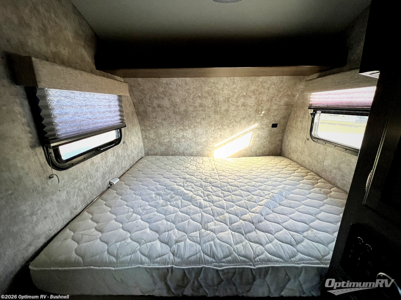 The very front of this Winnie Drop provides a queen size bed for sleeping that is 60" x 74" with overhead cabinets along the front wall. There is also a wardrobe for storage along the curb side for clothing, and so much more!