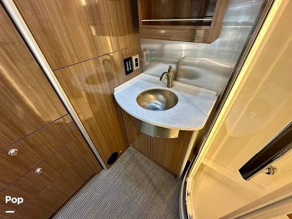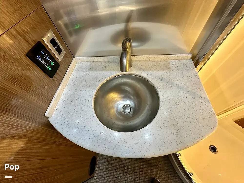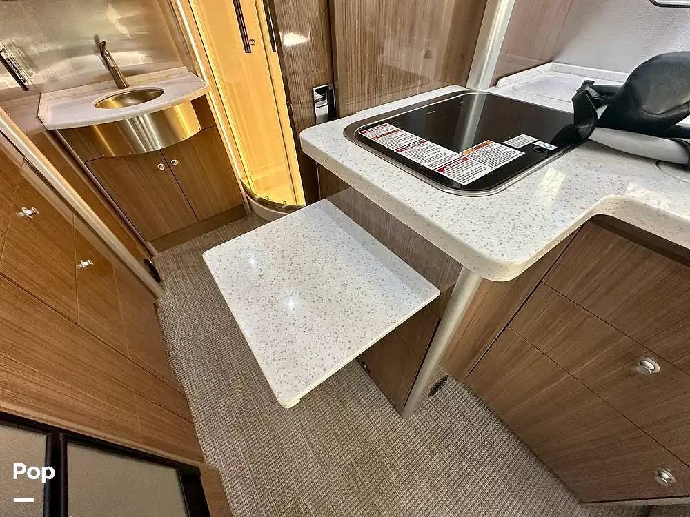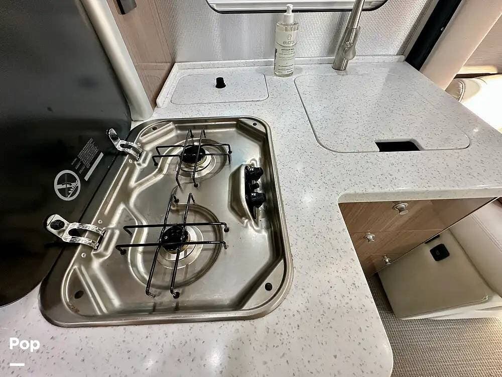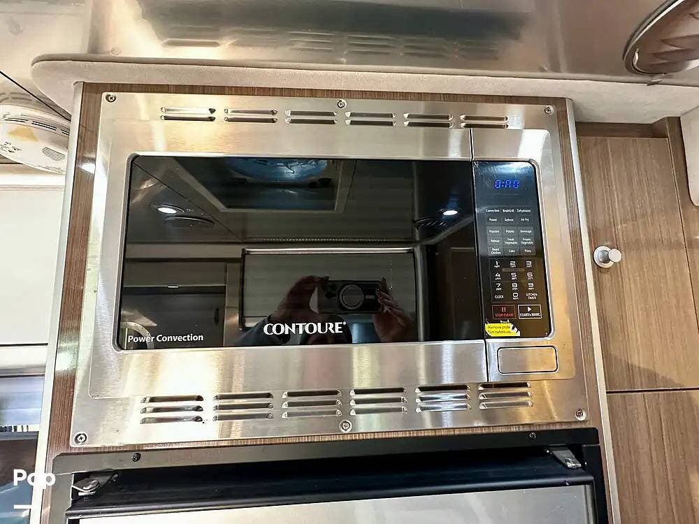 The galley has all you need to prepare a meal, with a stainless steel sink, Kohler faucet, two-burner propane cooktop, 9.1 CF refrigerator/freezer, and microwave-convection oven, ready to create anything from simple snacks to gourmet meals.
