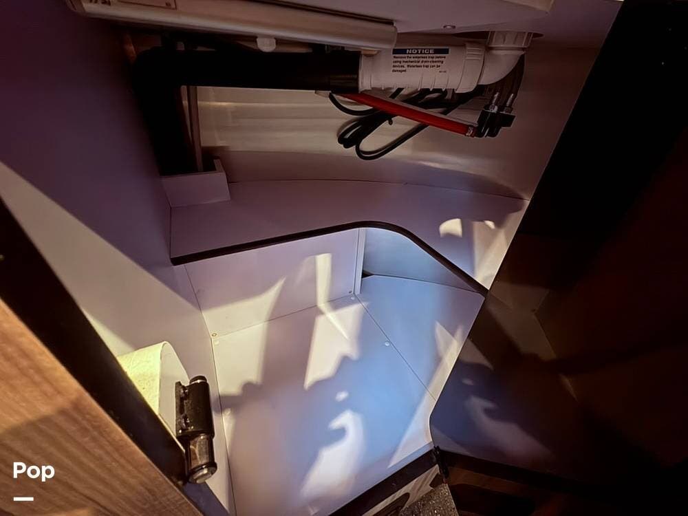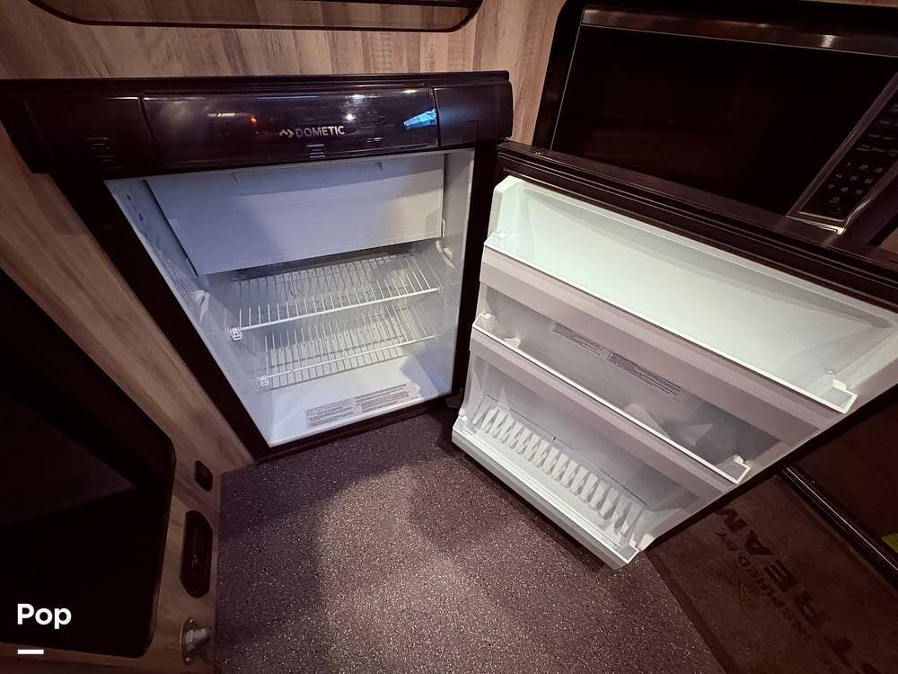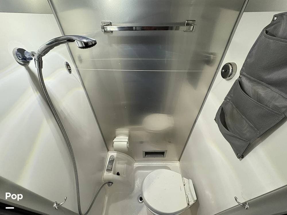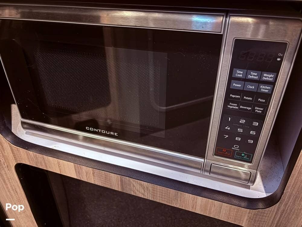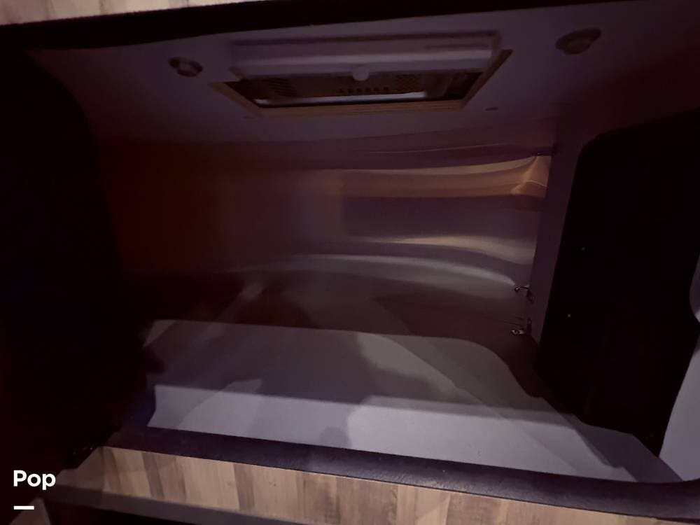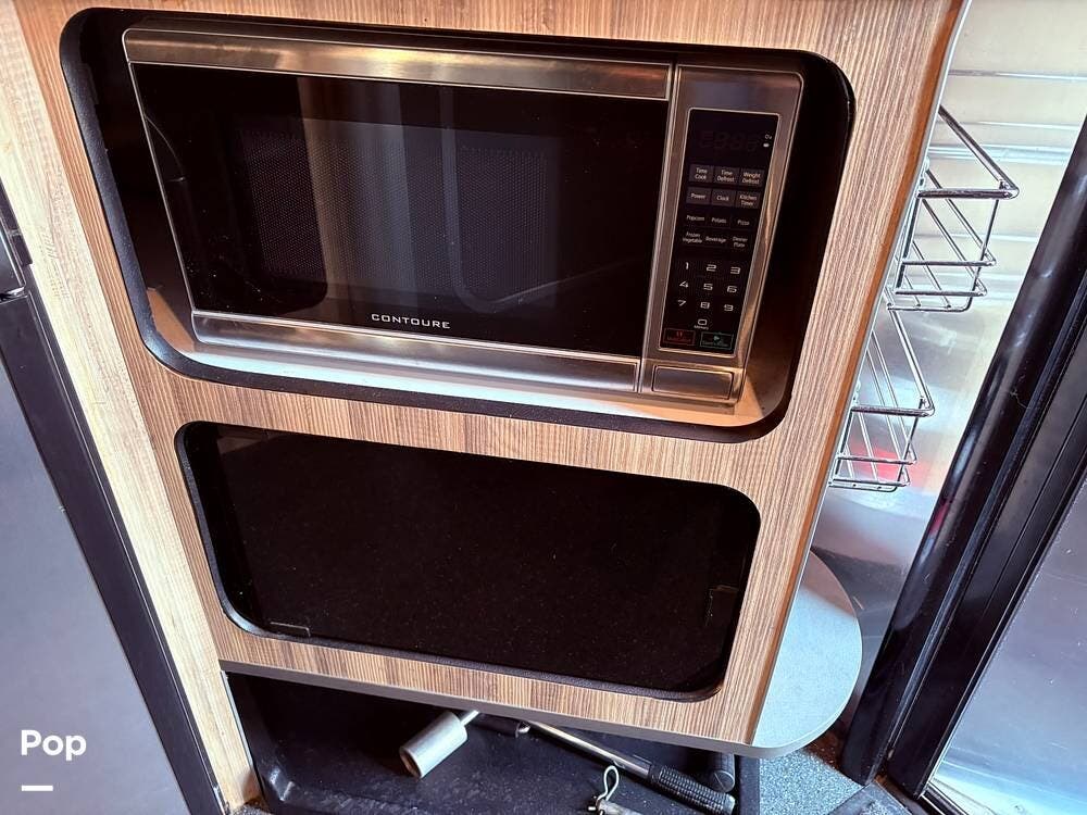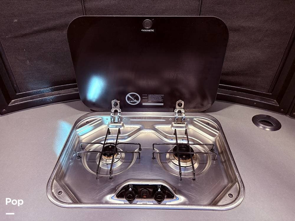 The kitchen packs a two-burner stove, sink, microwave, and fridge in a slide-out galley, plus a wet bath with shower and cassette toilet tucked beside it.