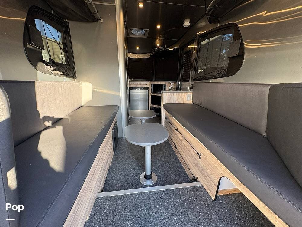 The living area flips the front bench into a lounge or work table while the rear half-dinette seats two for tacos and trail planning, all under a giant panoramic window.