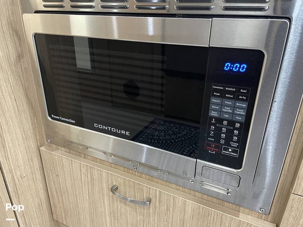The kitchen has a stove, oven, microwave, and refrigerator, providing everything needed for cooking on the road.