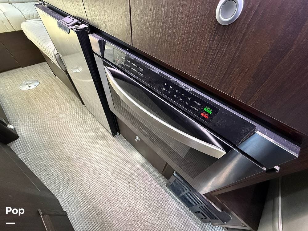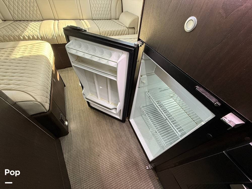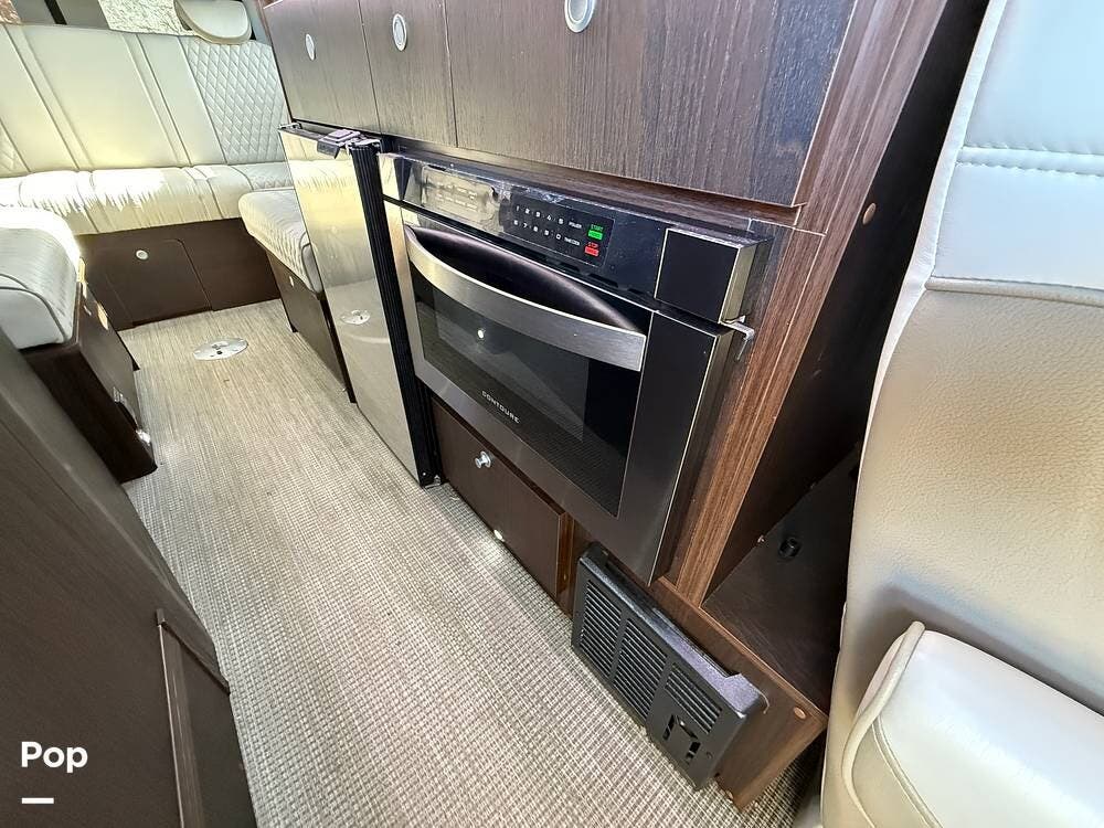 The galley kitchen rivals high-end apartments, boasting a stainless steel sink, two-burner stovetop, convection microwave, and a 3.1-cubic-foot refrigerator/freezer, all accented by solid surface countertops and LED lighting that casts a warm, inviting glow.
