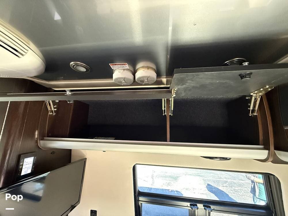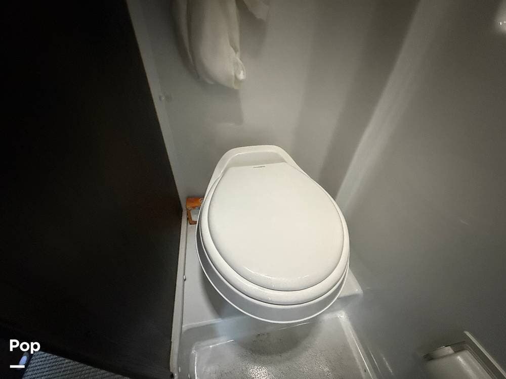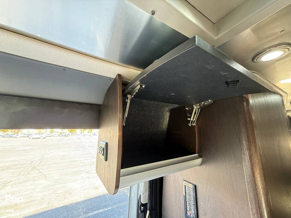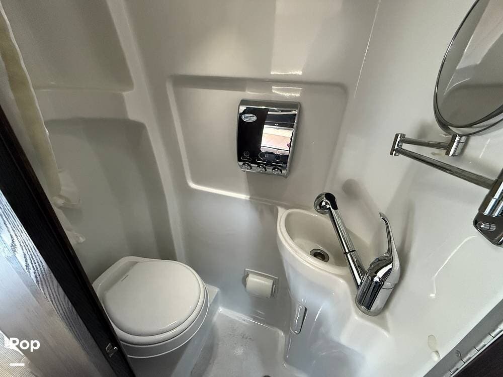 Overhead, ample storage lockers, and a wardrobe keep belongings organized, while the wet bath -- equipped with a porcelain toilet, shower, and sink -- ensures hotel-like convenience without the need for campground hookups.