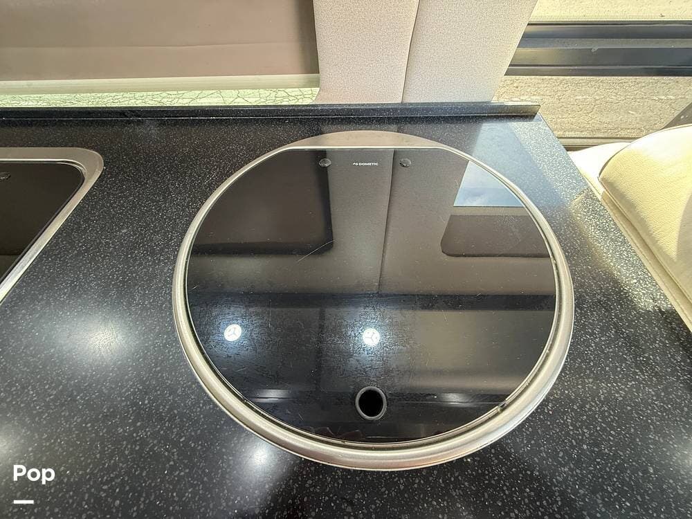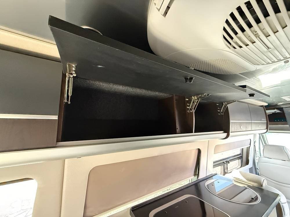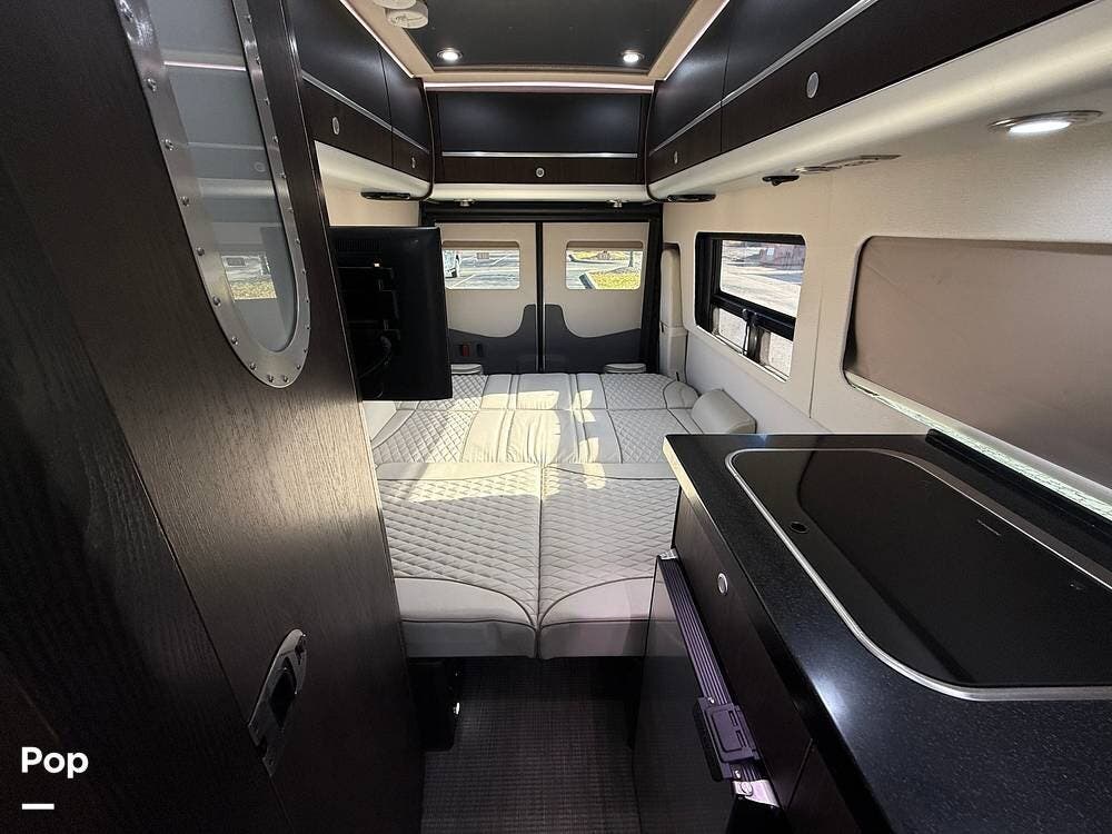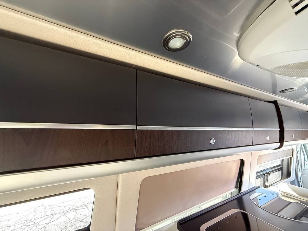 Step inside, where every inch of the cabin is meticulously crafted for comfort, functionality, and elegance. The extended wheelbase creates a spacious lounge area at the rear, featuring Ultraleather seating that converts seamlessly into a plush queen-size bed measuring 76 by 80 inches, complete with a memory foam mattress and privacy shades for restful nights under the stars.