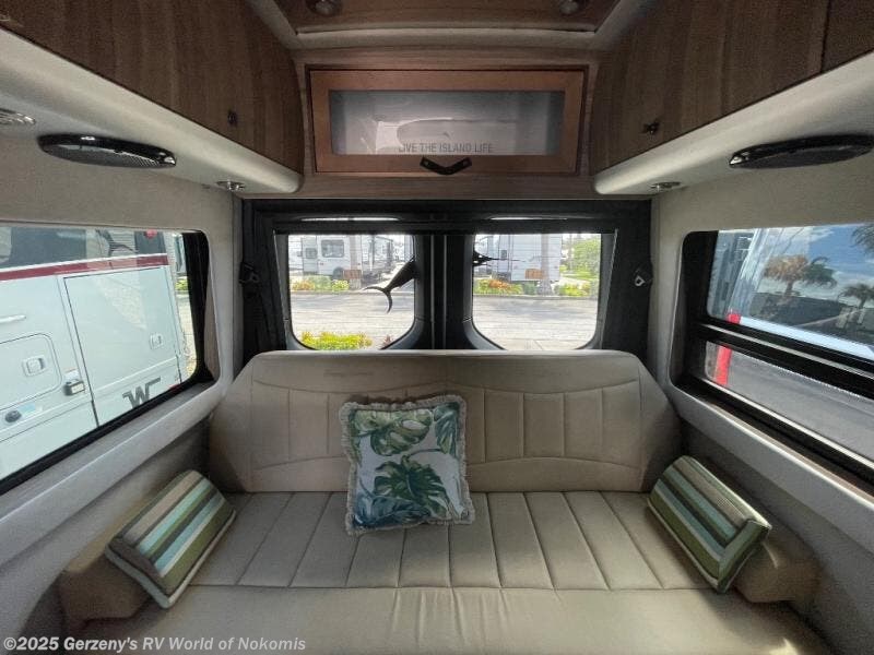 Imagine an island getaway no matter where you end up. If you enjoy a breeze from your ocean or lake spot, open up the rear doors to use the power screen, or the side screen door while making dinner or playing a card game at the removable tables. You and your friends can enjoy the four captain's chairs up front or the rear power sofa/bed with two side seats. This furniture also includes seat belts if more friends joined you, and two can sleep on the sofa and seats as they convert to a singular sleeping space. The wet bath will come in handy for those quick highway stops and while you are at your final destination, allowing you to skip the public facilities. You will also find plenty of lockers and cabinetry for storage throughout for those longer trips.