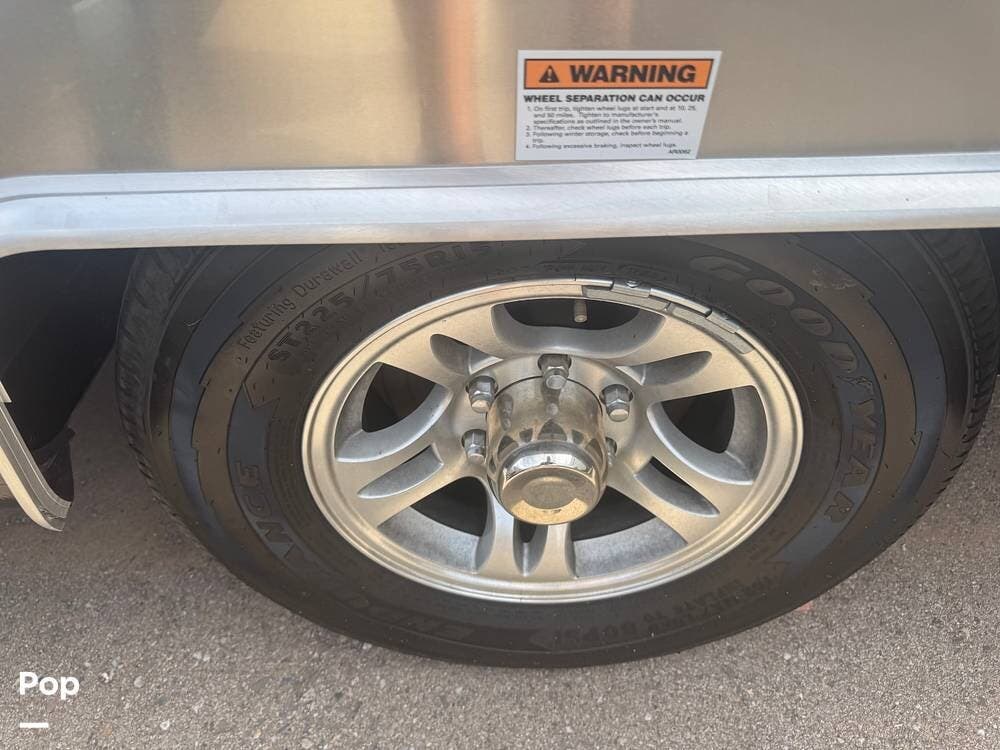 Step inside, and the trailer reveals a bright, modern interior designed for efficient comfort. The front of the coach features the 22FB's signature front bedroom, where a walk-around bed sits beneath panoramic windows that fill the space with natural light.