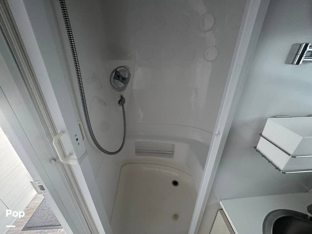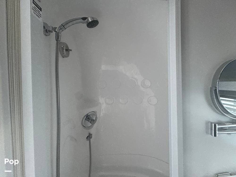 At the rear of the trailer is a surprisingly spacious full bathroom with a stand-up shower, vanity, and toilet. The layout gives the bathroom its own private area, making it practical for longer trips.