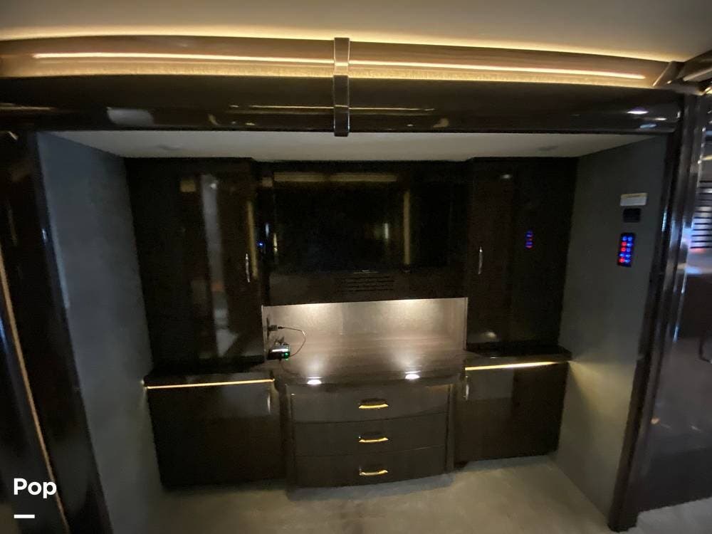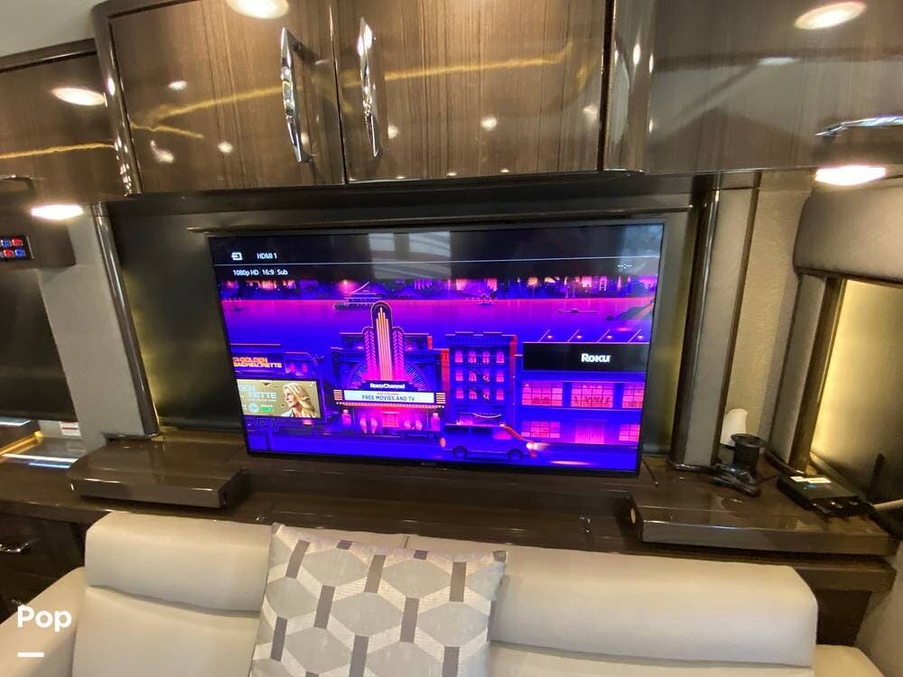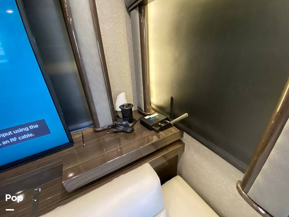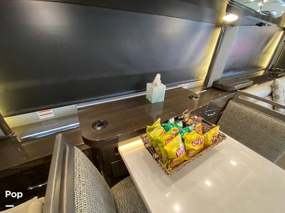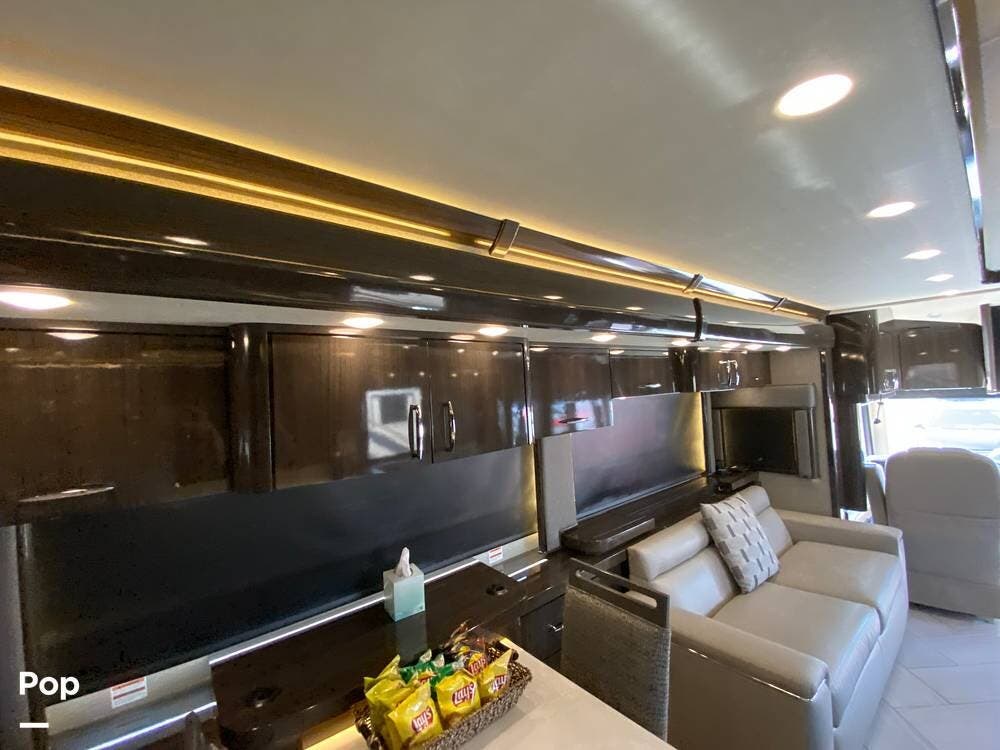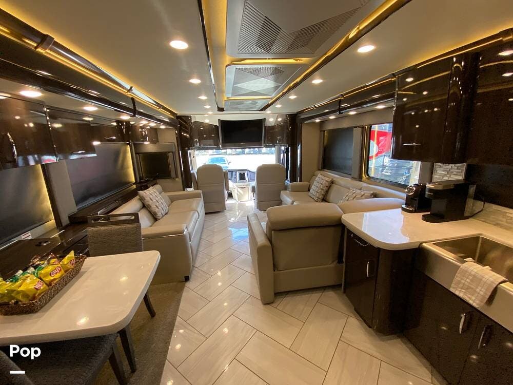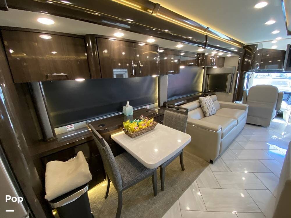 Further rear, we have another LED TV that pops up from the counter, which has full Wi-Fi and routers to turn this RV into a workstation as needed. A beautiful dining table with separate chairs has the same high-end wood finish as the entire Coach. The 2 Ultra leather Sofas face each other, with one turning into a queen-size bed.