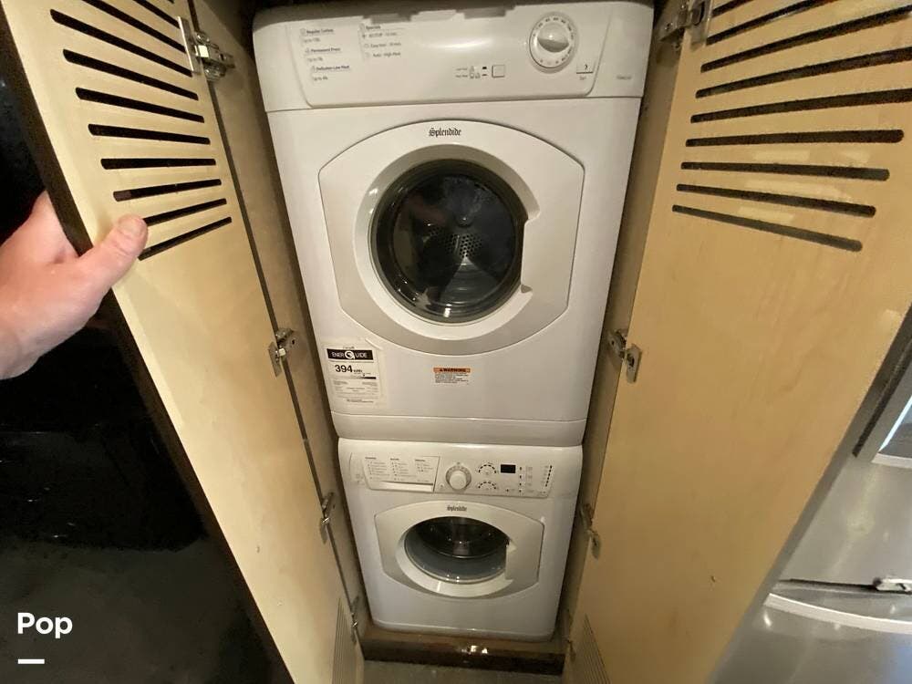 Further rear, you are in the highly appointed modern kitchen. There is a washer and dryer pair, a full-size Stainless Steel refrigerator with an icemaker, a sleek modern stove, and a double kitchen sink with a solid surface countertop. Again, the high-end wood cabinets are included. Also, let's not forget the digitally controlled wine refrigerator.