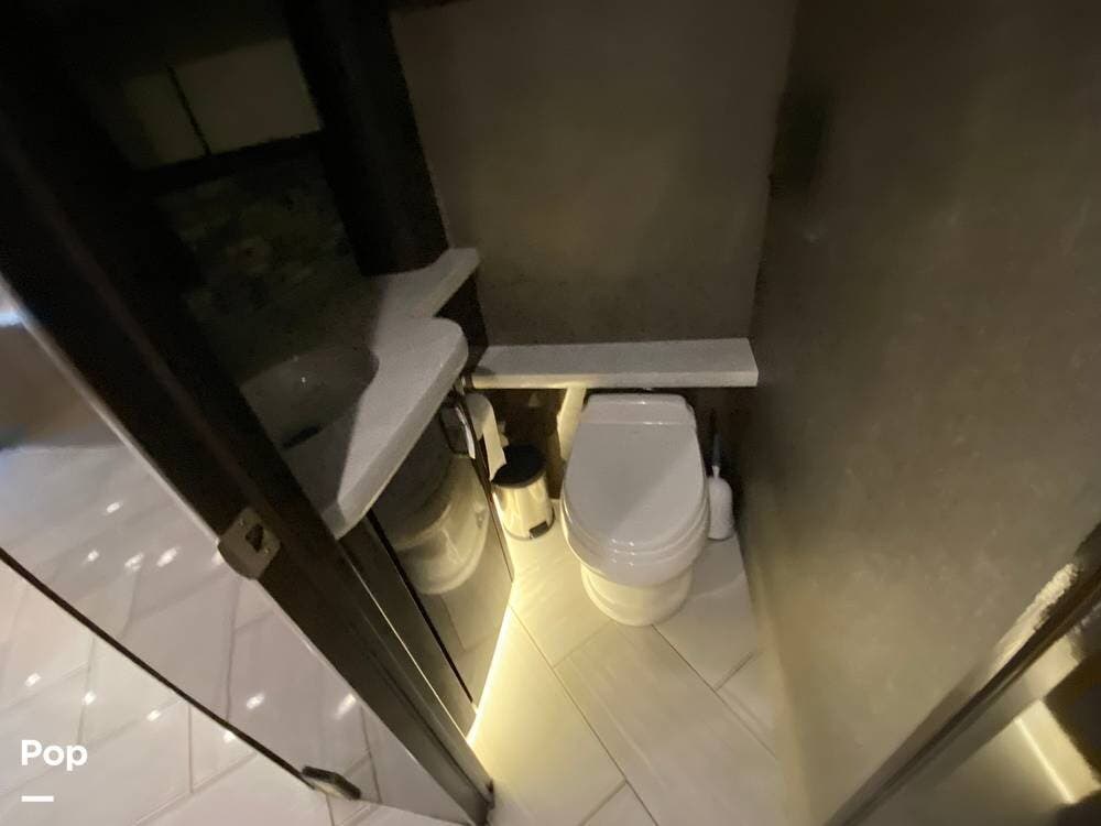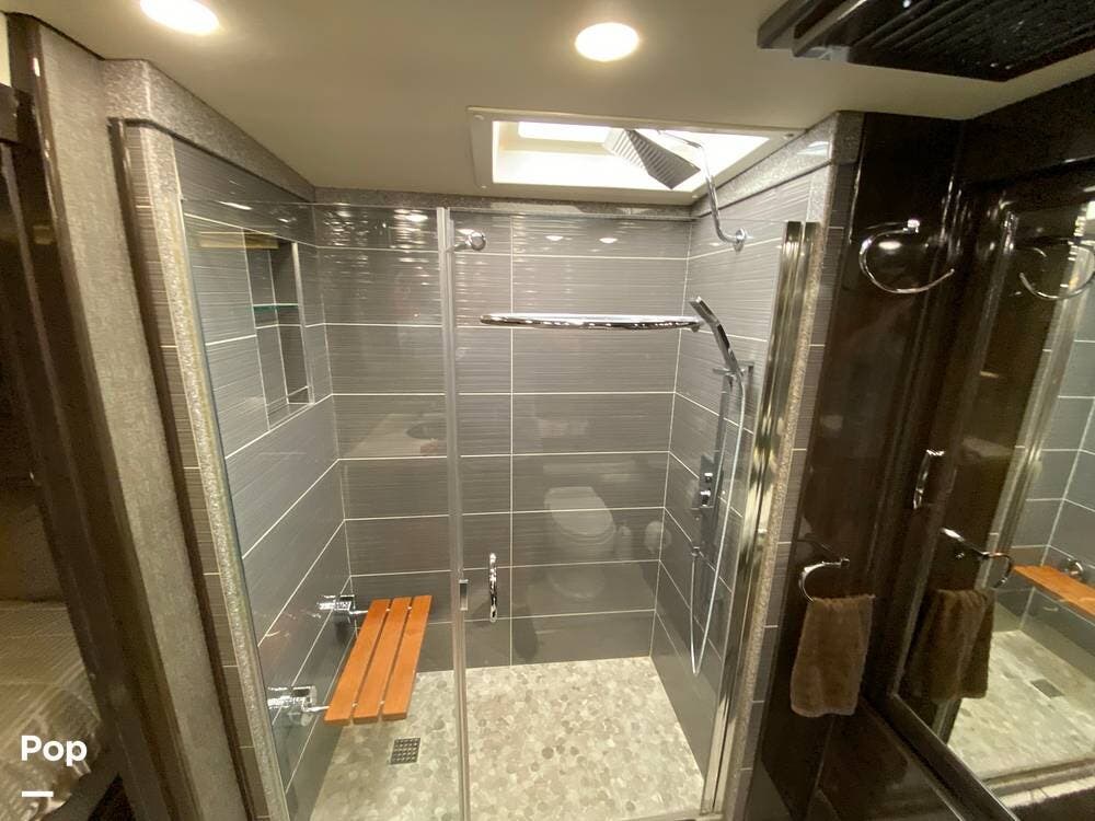 Rear, we are in the master suite, which includes a huge bathroom with a residential-sized shower and a seat, just like home. The king bed with a Sleep Number mattress welcomes you at the end of the day, and yes, again, the cabinetry in the bedroom with TV and ward makes you feel at home.