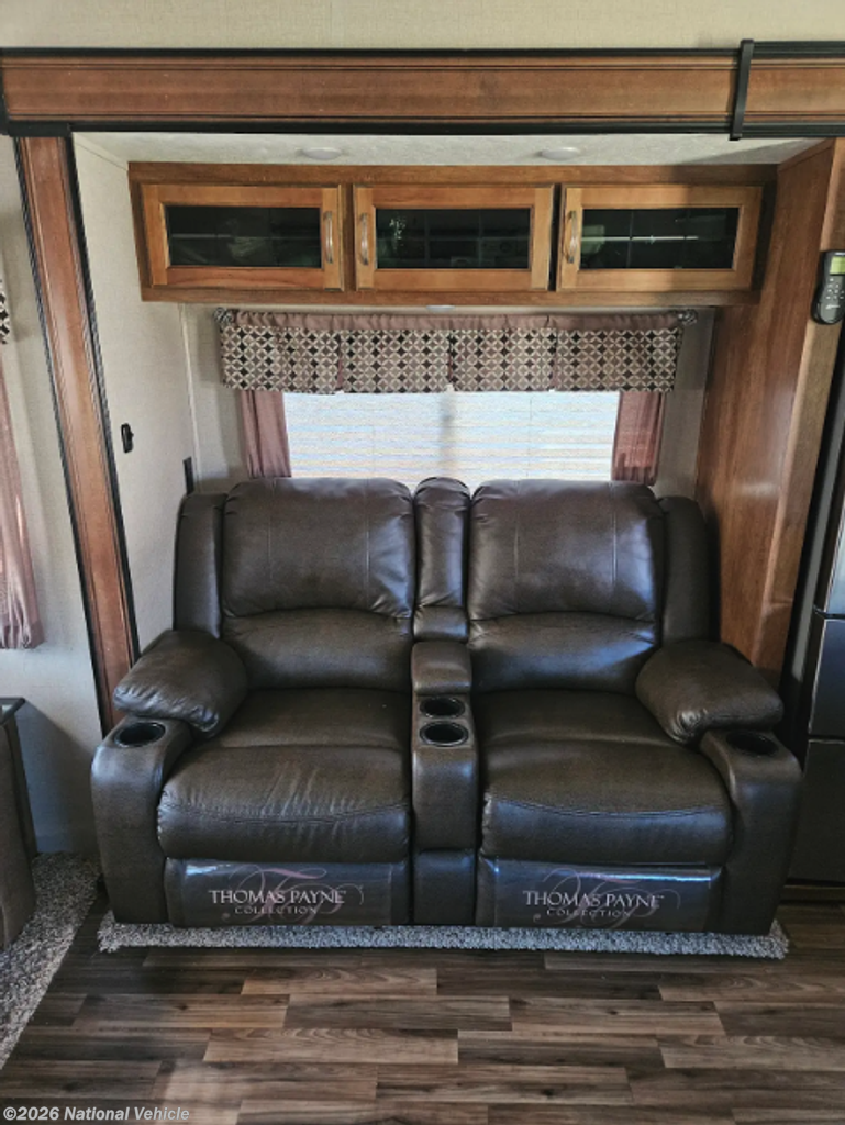 Step inside to a beautifully designed rear living floorplan that creates a spacious and welcoming atmosphere. Large windows surround the living area, filling the coach with natural light and offering scenic views from your campsite. Relax on the comfortable sofa or theater seating while enjoying the entertainment center and fireplace, making it the perfect place to unwind after a day of exploring.