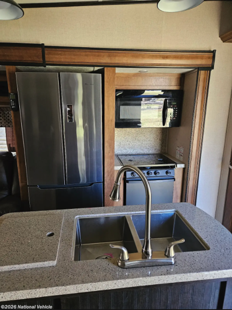 The well-appointed kitchen is ideal for preparing meals on the road, featuring solid surface countertops, a large refrigerator, microwave, oven, stove, and abundant cabinetry for all your cooking essentials. The nearby dinette provides a cozy spot for meals, morning coffee, or game night with family and friends.