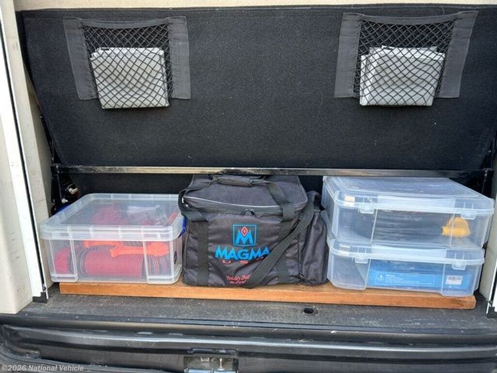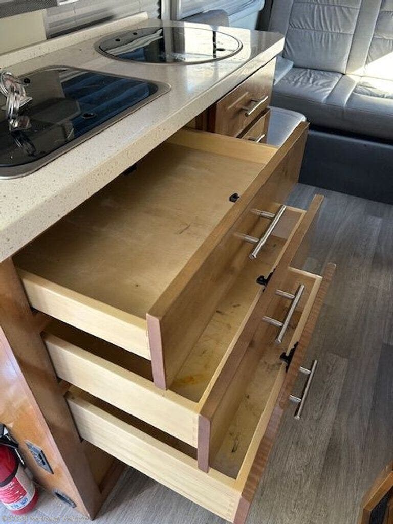 Lots of overhead storage, plus space behind driver's seat, kitchen drawers, deep drawer for trash can, pantry, and space behind the couch. A choice of bike racks.