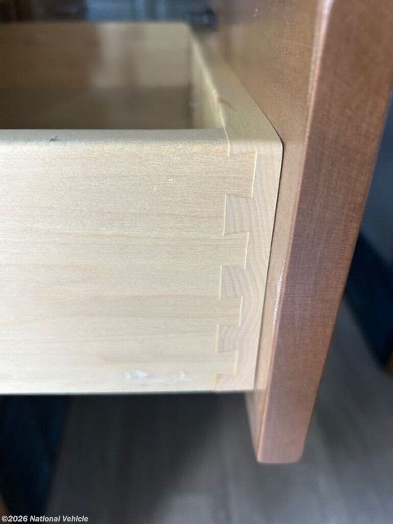 Elegant interior with natural maple Amish-made cabinetry, Corian countertop. Two-burner propane stove and a microwave oven, or you can cook outside with a portable induction burner (provided). Sink with fold-down faucet and lid, large refrigerator and freezer.