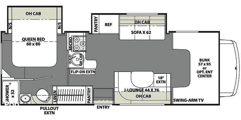 This Freelander 26DS is the premium package group with two slides and a generator. The Coachmen difference is apparent with all of its higher-end appointments and attention to detail. The J-lounge with the 18-inch extension is an example of that attention. The lounge has under-seat storage and converts into an additional sleeping area. With a cab-over bunk, the J-lounge, and the queen-size bed in the master, you will have room to sleep 5-6.
