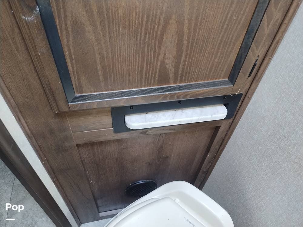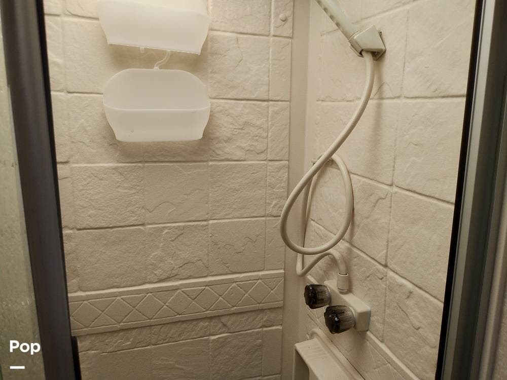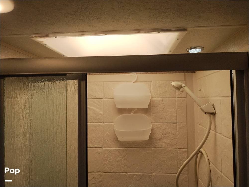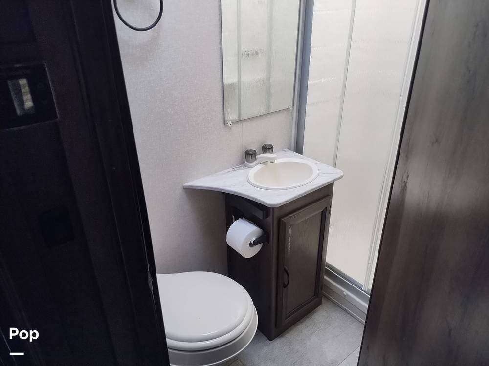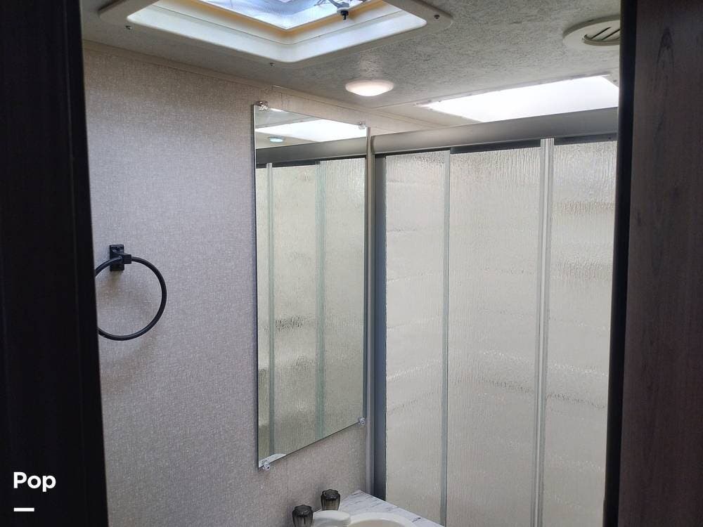 A private pocket door separates the full bath from the living area. It features a sink, vanity, medicine cabinet, toilet, shower, and skylight to the passenger side.