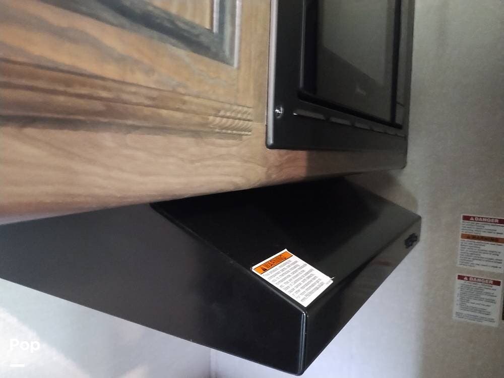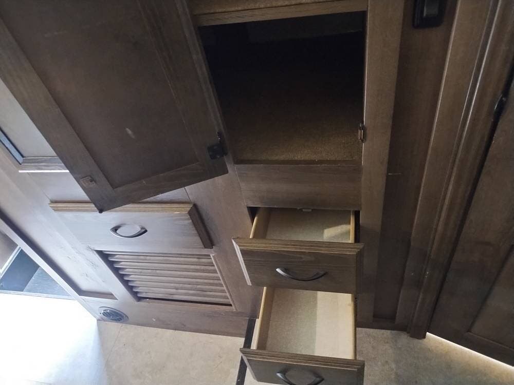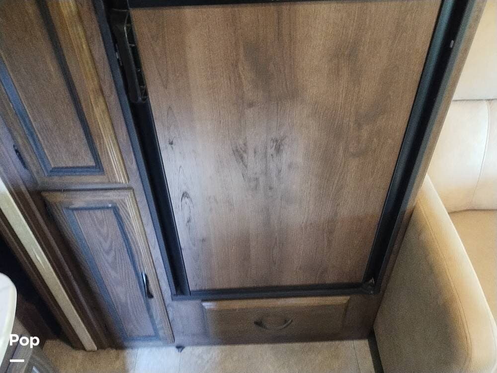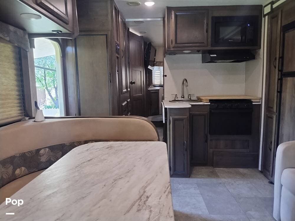The driver and passenger seats, which swivel rearward, expand the eating area. The full kitchen follows on the entry side, featuring a large SS sink, a two-door refrigerator, a three-burner stove and oven, and an over-the-range microwave with an exhaust fan and light. The seller appreciates the full suspension drawer pantry.
