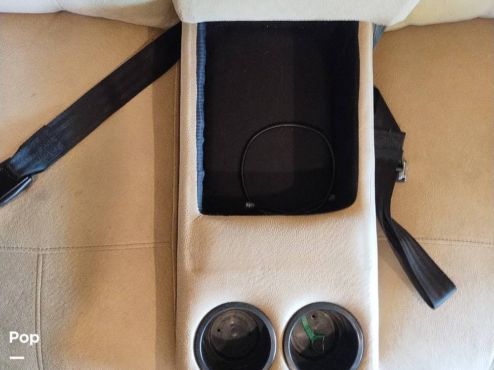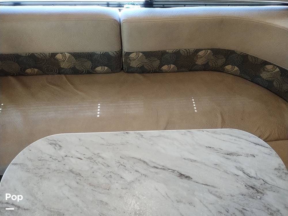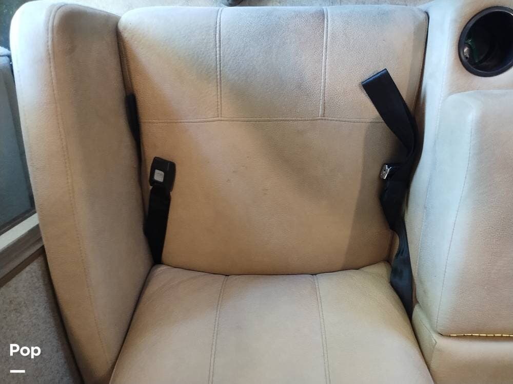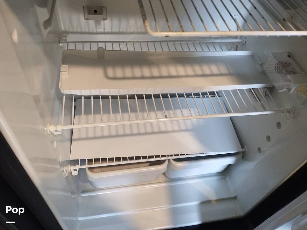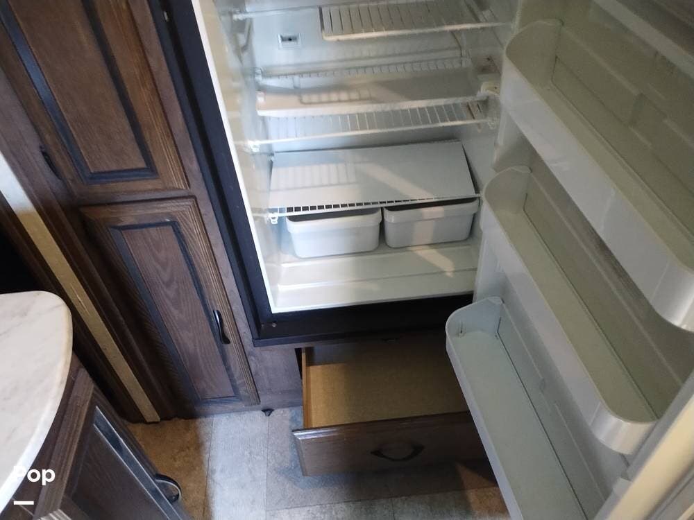 The driver and passenger seats, which swivel rearward, expand the eating area. The full kitchen follows on the entry side, featuring a large SS sink, a two-door refrigerator, a three-burner stove and oven, and an over-the-range microwave with an exhaust fan and light. The seller appreciates the full suspension drawer pantry.
