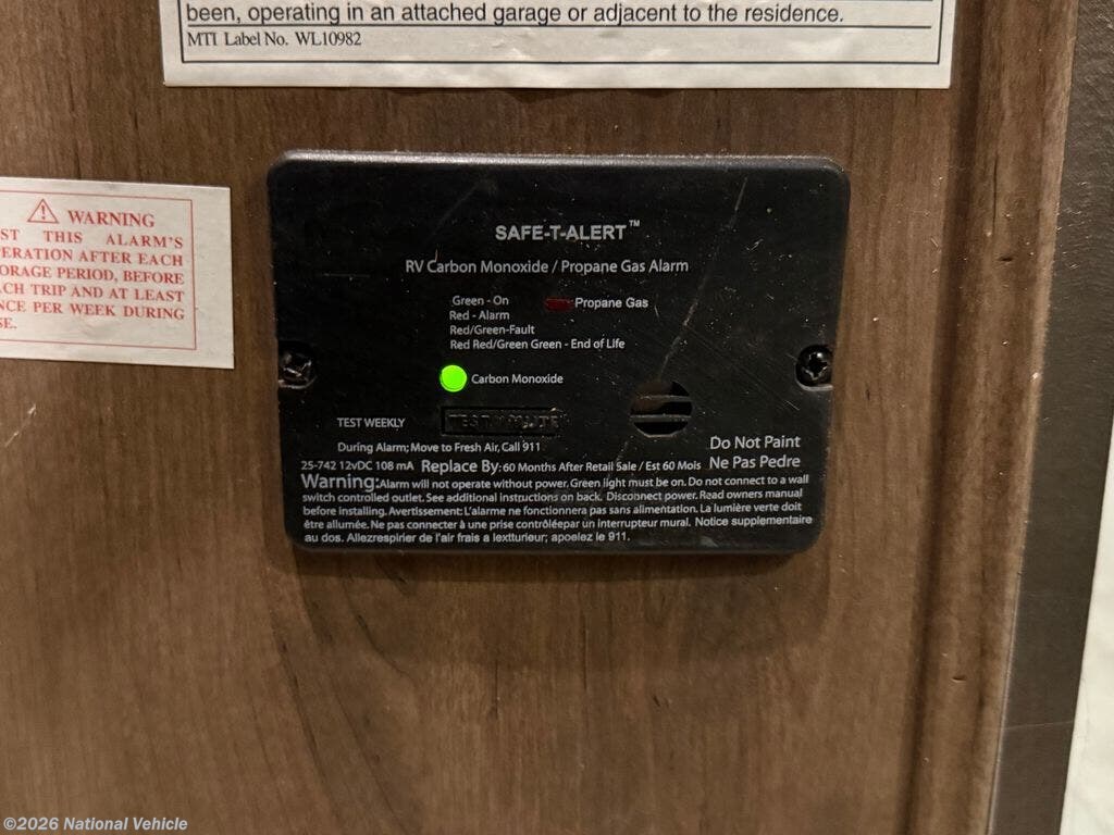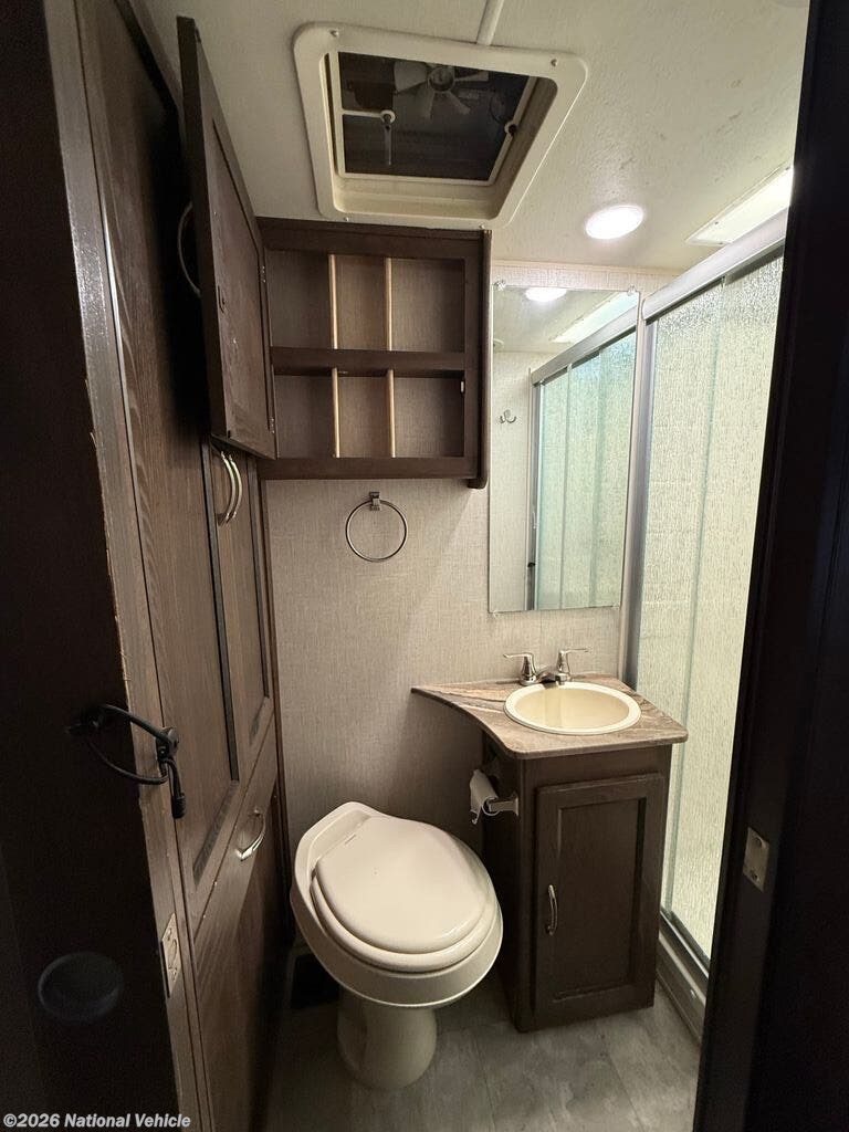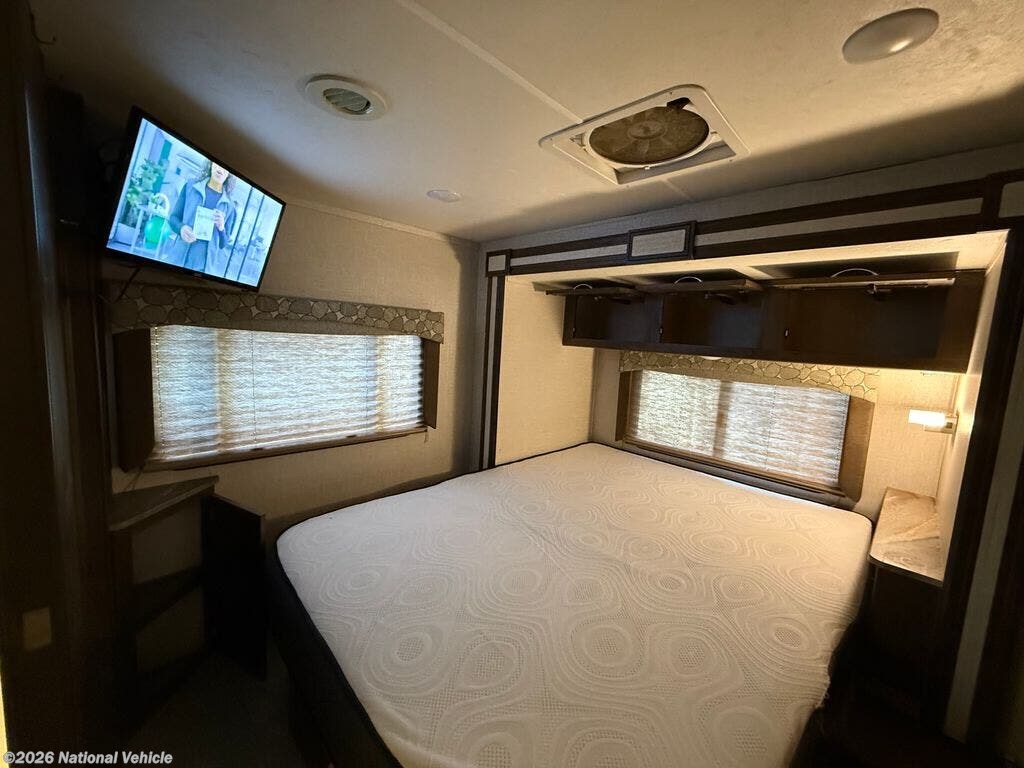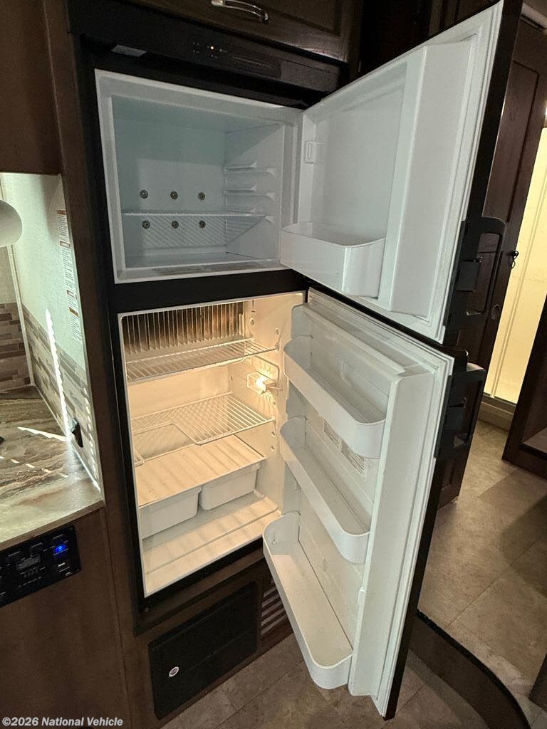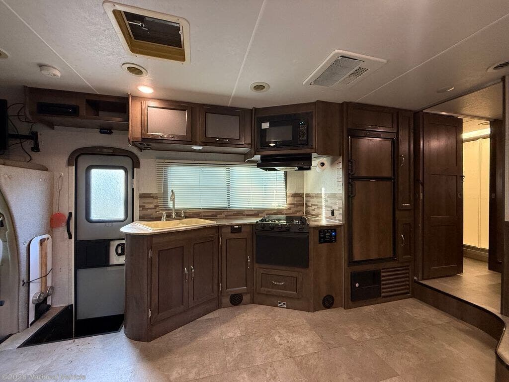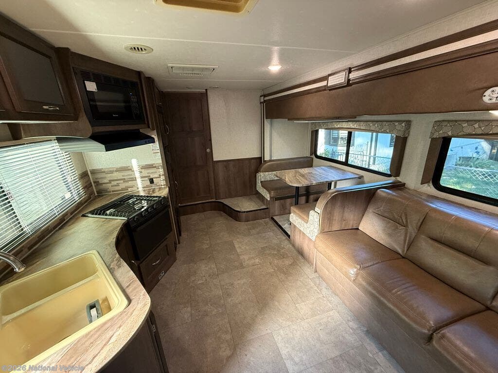 Inside, you'll find a bright and welcoming interior with residential-style finishes and smart design. A cab-over bunk provides extra sleeping capacity, while the main living area features a comfortable dinette and sofa, both of which can convert to additional sleeping space. The kitchen is fully equipped with a three-burner range, oven, microwave, double sink, and a double-door refrigerator?ideal for preparing meals on the go. Toward the rear, the private bedroom includes a walk-around queen bed, ample wardrobe storage, and direct access to the full bathroom, which features a spacious shower, vanity, and toilet.