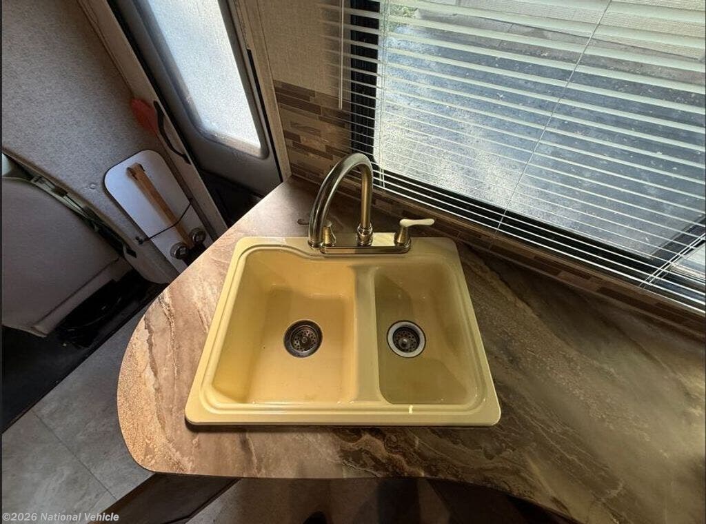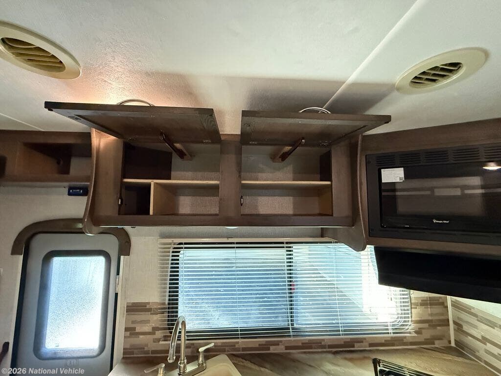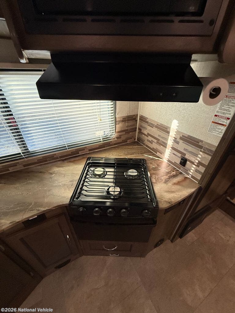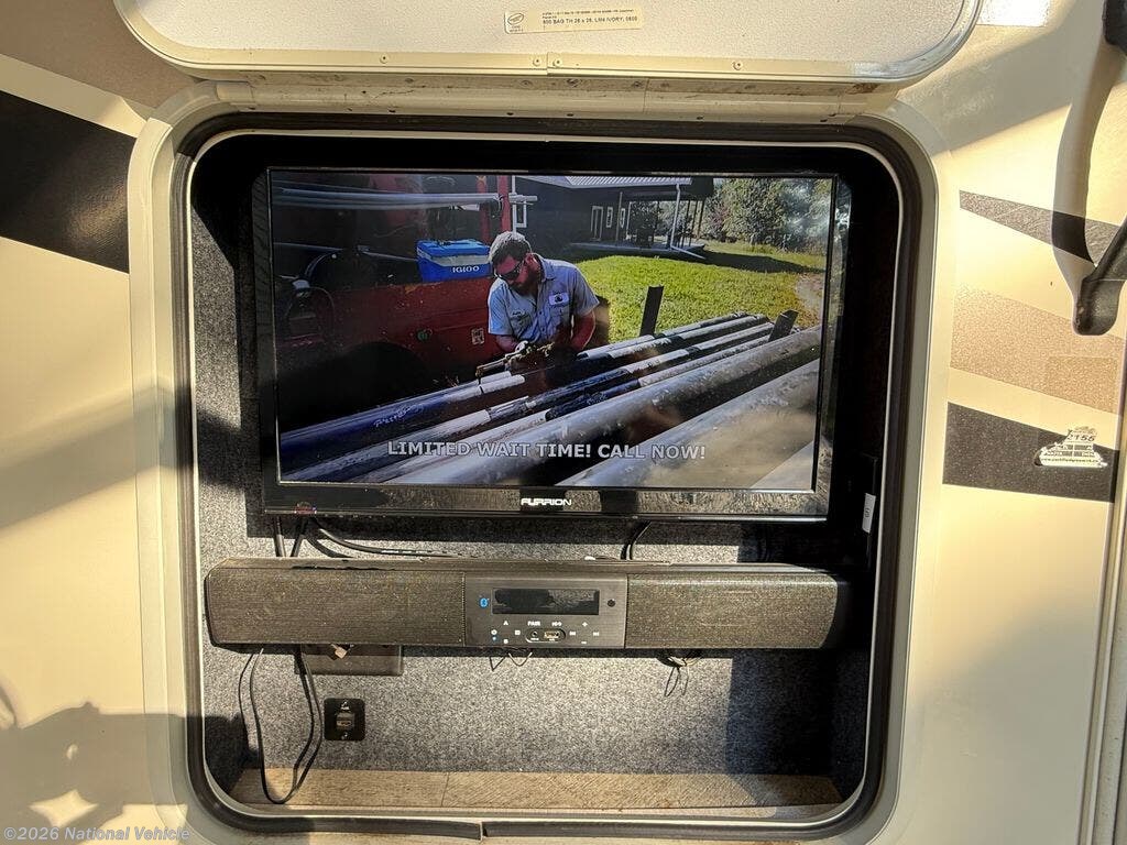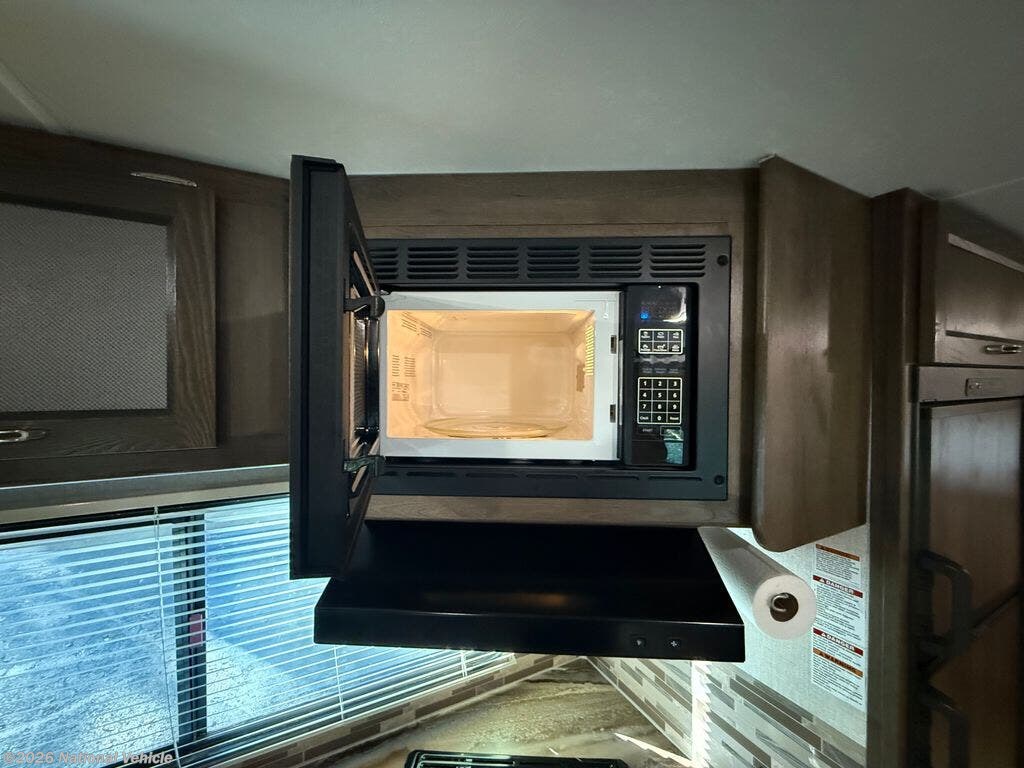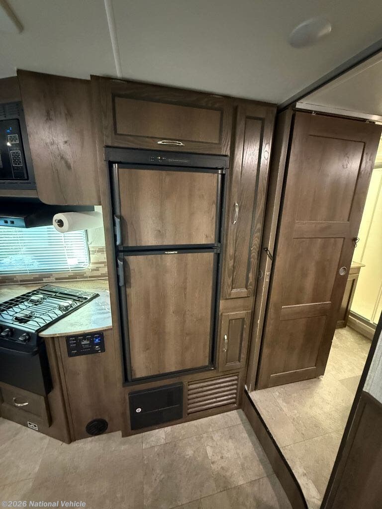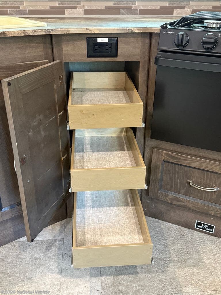 Inside, you'll find a bright and welcoming interior with residential-style finishes and smart design. A cab-over bunk provides extra sleeping capacity, while the main living area features a comfortable dinette and sofa, both of which can convert to additional sleeping space. The kitchen is fully equipped with a three-burner range, oven, microwave, double sink, and a double-door refrigerator?ideal for preparing meals on the go. Toward the rear, the private bedroom includes a walk-around queen bed, ample wardrobe storage, and direct access to the full bathroom, which features a spacious shower, vanity, and toilet.