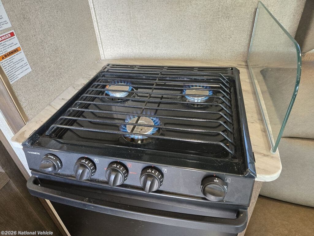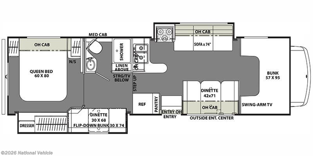 Step inside mid coach along the curb side and find a spacious living area and kitchen combined. There is a 42" x 71" booth dinette to your right including overhead cabinets for your things. Enjoy a swing arm TV up front above the passenger seat, and an over cab bunk that is 57" x 95". Opposite the door side in this same space you will enjoy more seating with a slide out 74" sofa that also features storage cabinets above. This slide is home to a three burner range and overhead microwave oven as well.