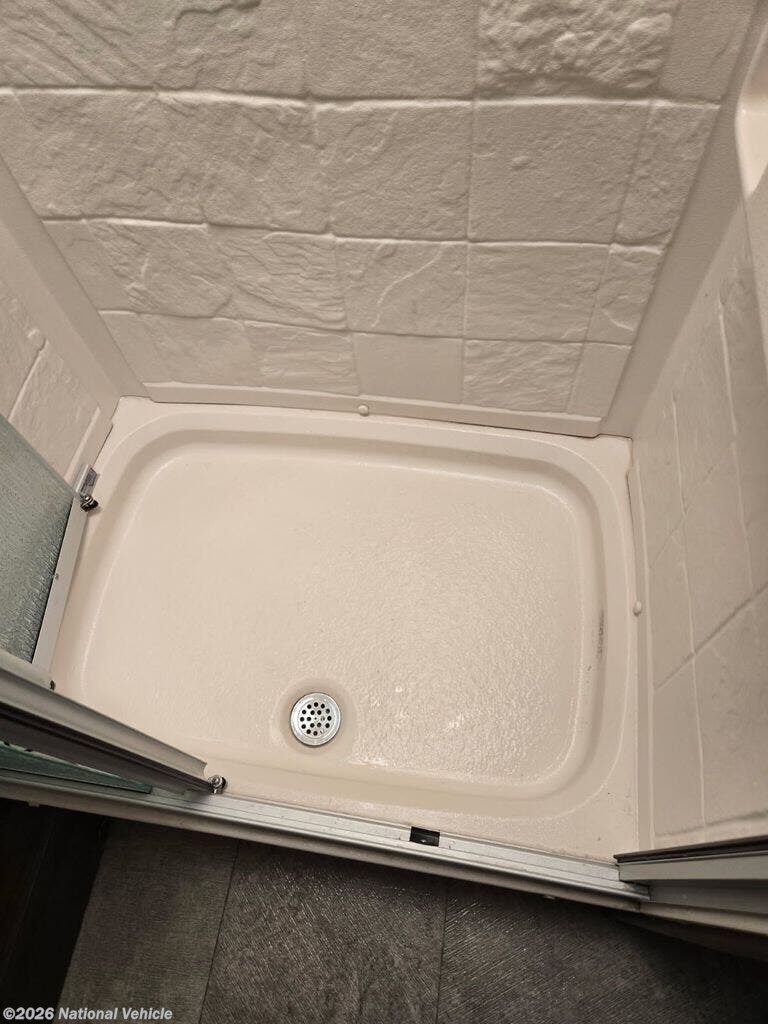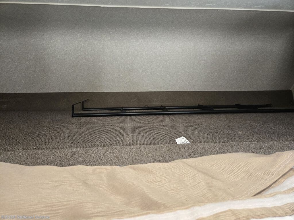 Step up just beyond the refrigerator to a comfortable bedroom and bath area. There is a slide out on the left that features a 30" x 68" dinette with a flip-up bunk above, and a dresser plus wardrobe storage in the master bedroom portion which can be closed off with a space saving sliding door. The master offers a queen bed with dual nightstands, and overhead cabinets at the head of the bed. Across from the dinette just outside the bathroom door is storage with TV below.