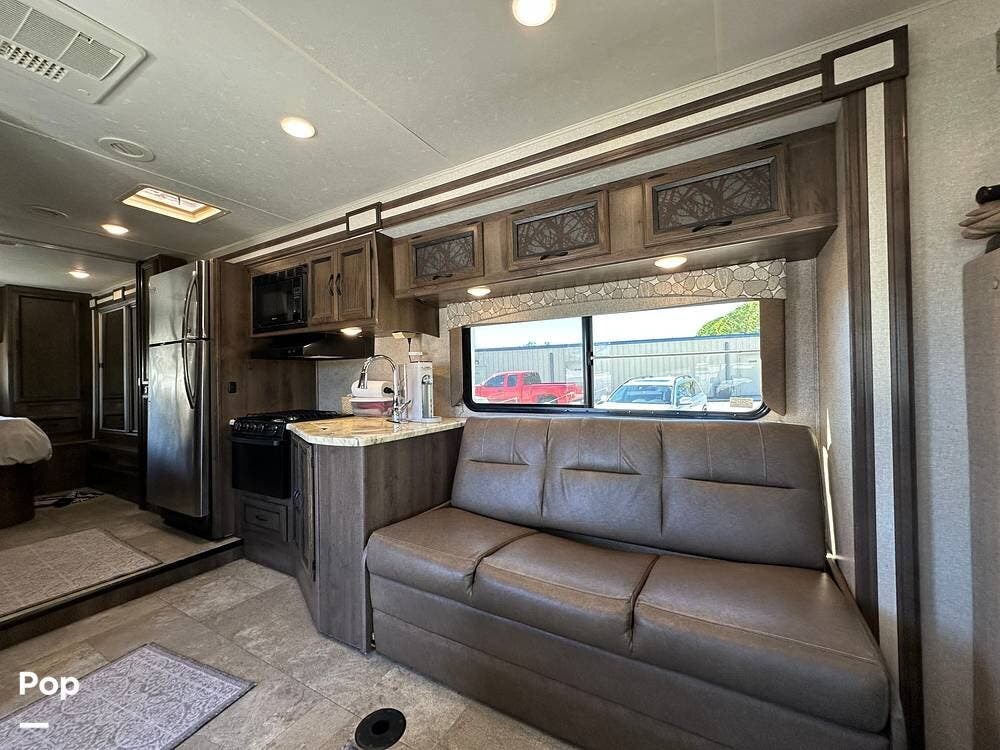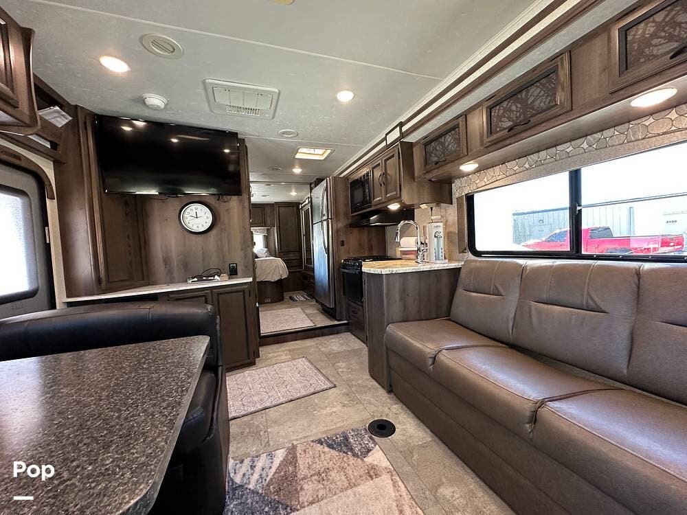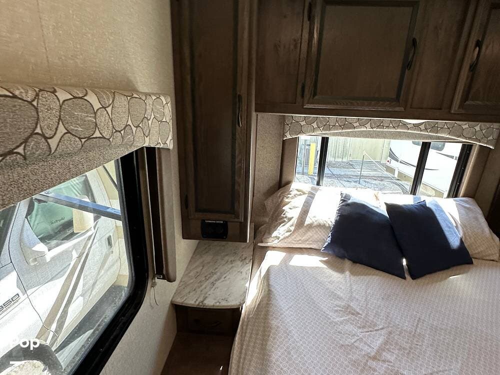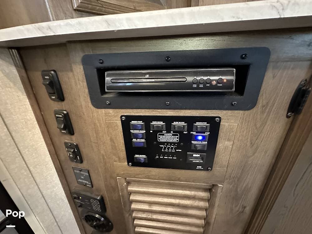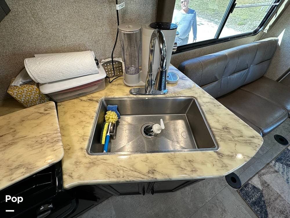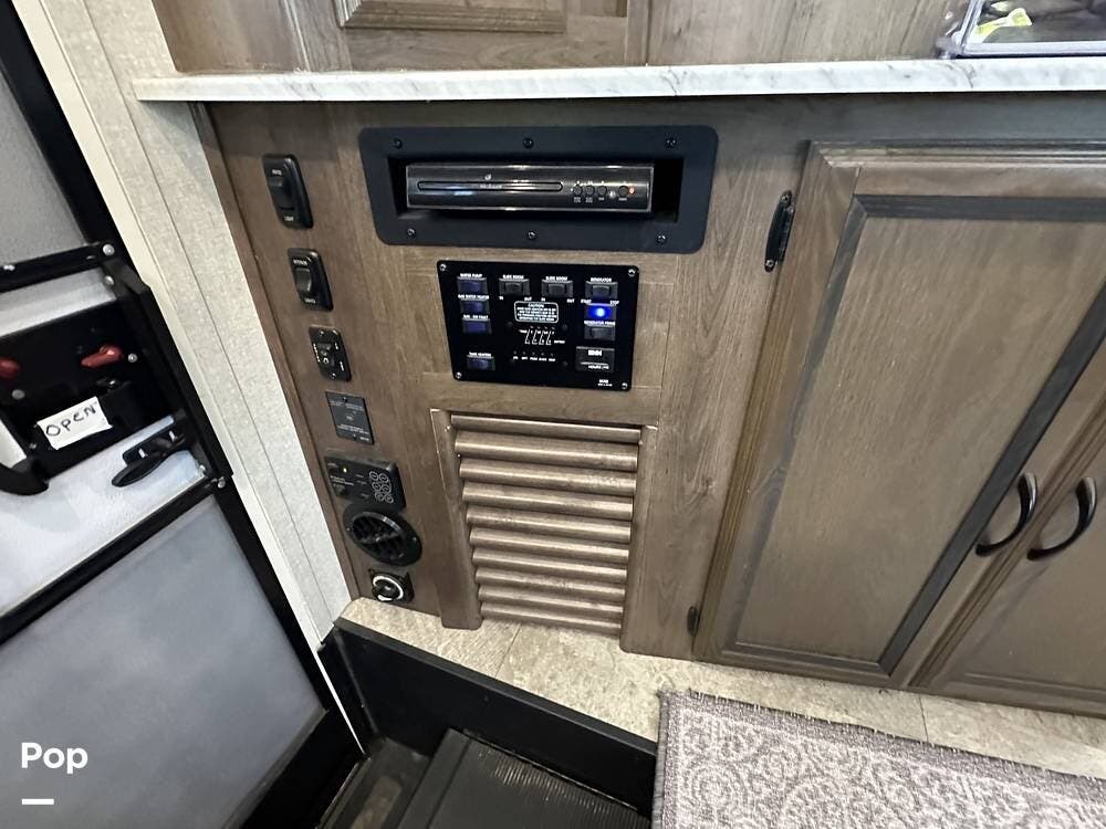 Outside, this Freelander Premier Package includes many features such as, stabilizer jacks. air-assist rear suspension, high-gloss color-infused fiberglass sidewalls, and a molded fiberglass front wrap. It also has a large power patio awning and an exterior entertainment center with a sound system and TV. LED lighting, solar panel connection port, and 7,500-lb. tow hitch with a 7-way plug, and more! Seller recently added a 3 way camera system (rear, passenger and driver side views) for added visibility and safety on the road.