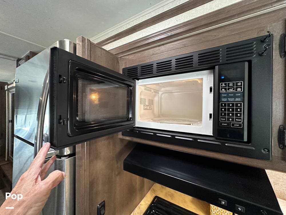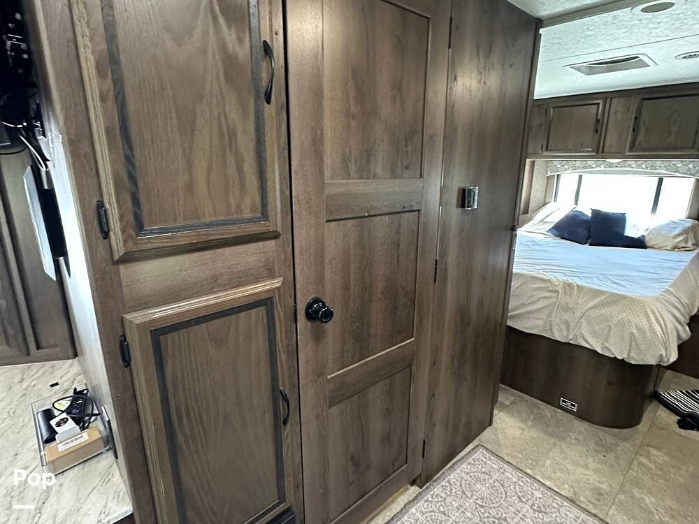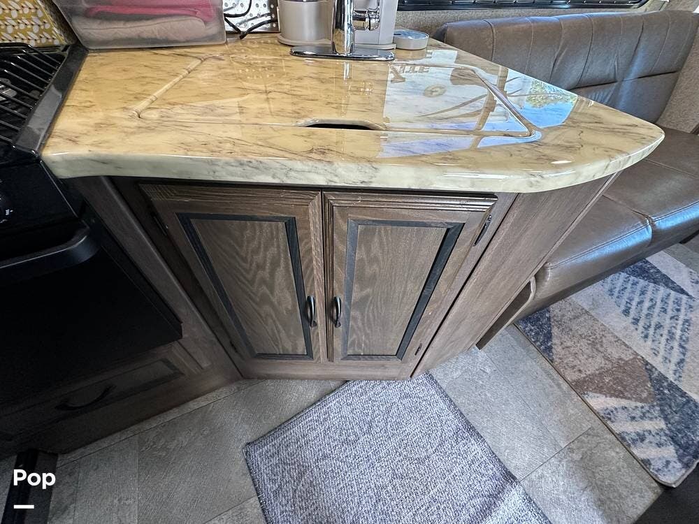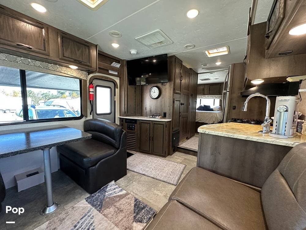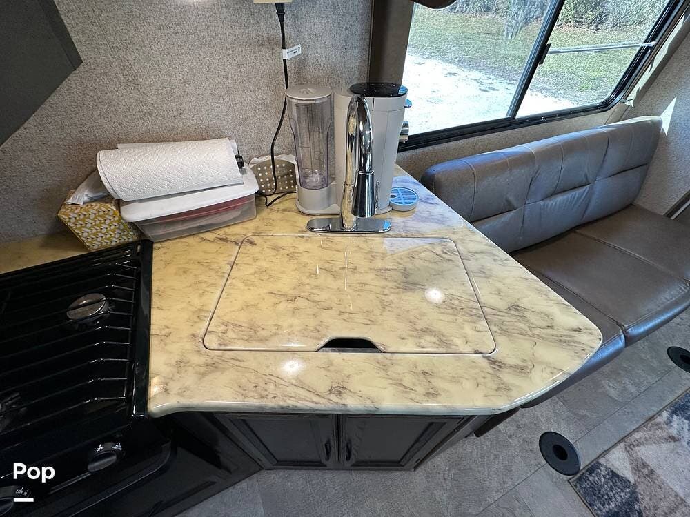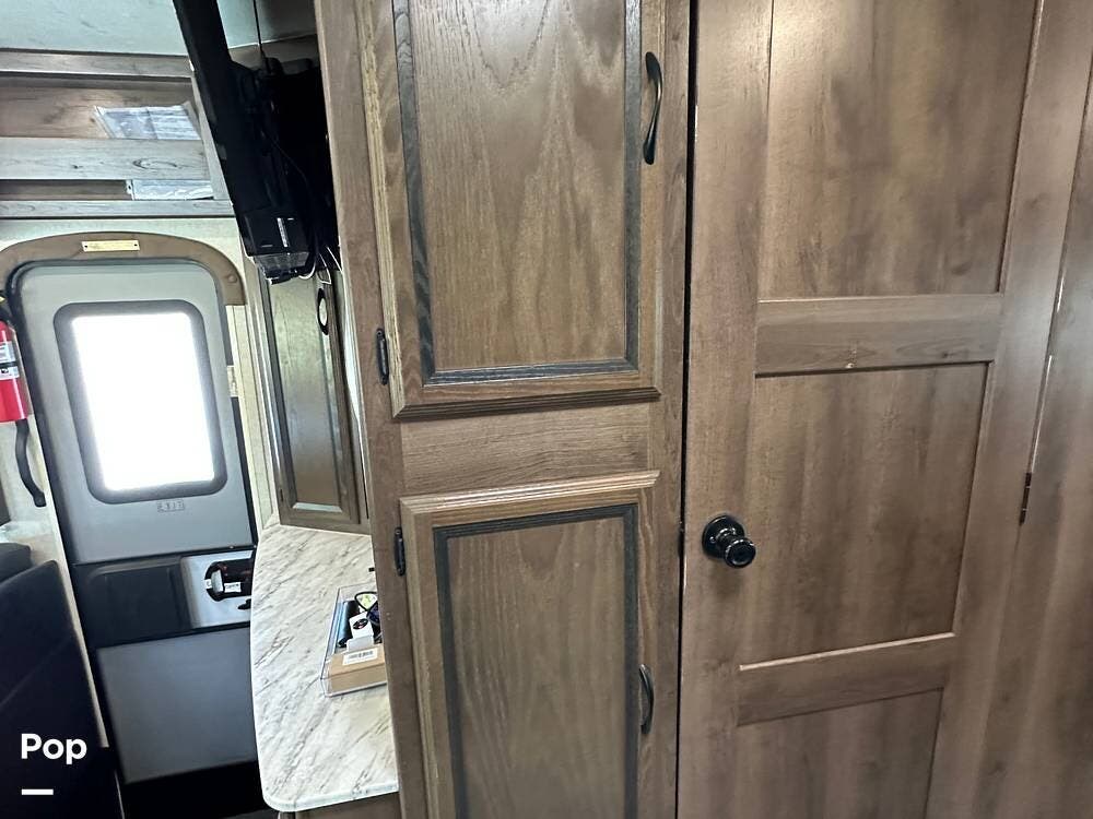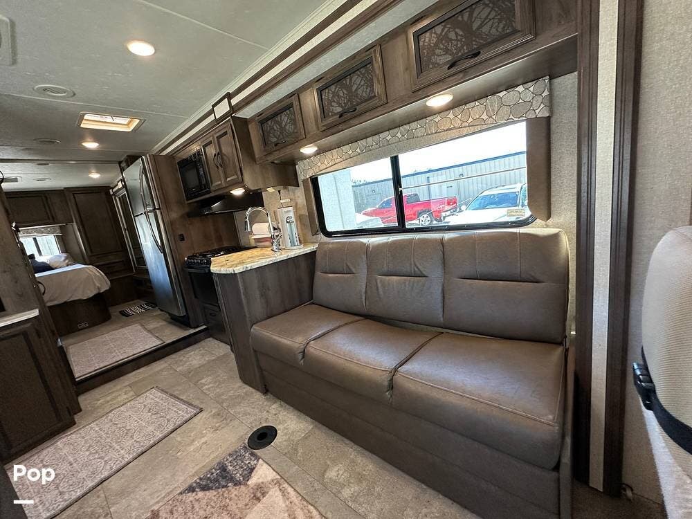 Outside, this Freelander Premier Package includes many features such as, stabilizer jacks. air-assist rear suspension, high-gloss color-infused fiberglass sidewalls, and a molded fiberglass front wrap. It also has a large power patio awning and an exterior entertainment center with a sound system and TV. LED lighting, solar panel connection port, and 7,500-lb. tow hitch with a 7-way plug, and more! Seller recently added a 3 way camera system (rear, passenger and driver side views) for added visibility and safety on the road.
