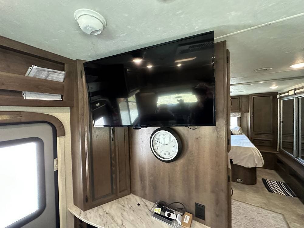 Just across from the galley on the passenger side is the entertainment center with a large wall-mounted TV.