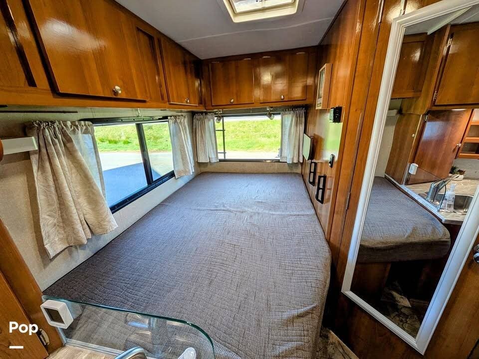 Towards the rear, the private bathroom features a large stand-up shower with a skylight, a porcelain toilet, and a vanity, while the dedicated bedroom area provides a cozy retreat after a long day of travel.