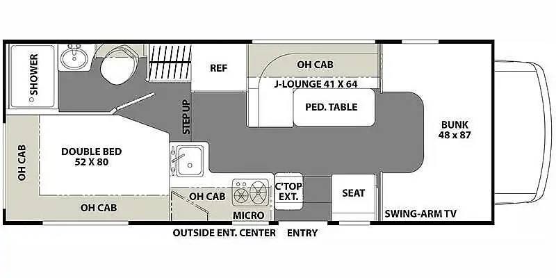The floor plan is designed for versatility, featuring a comfortable J-Lounge dinette in the living area that easily converts into a sleeping space, bringing the total sleeping capacity to 6 when the spacious over-cab bunk is included.