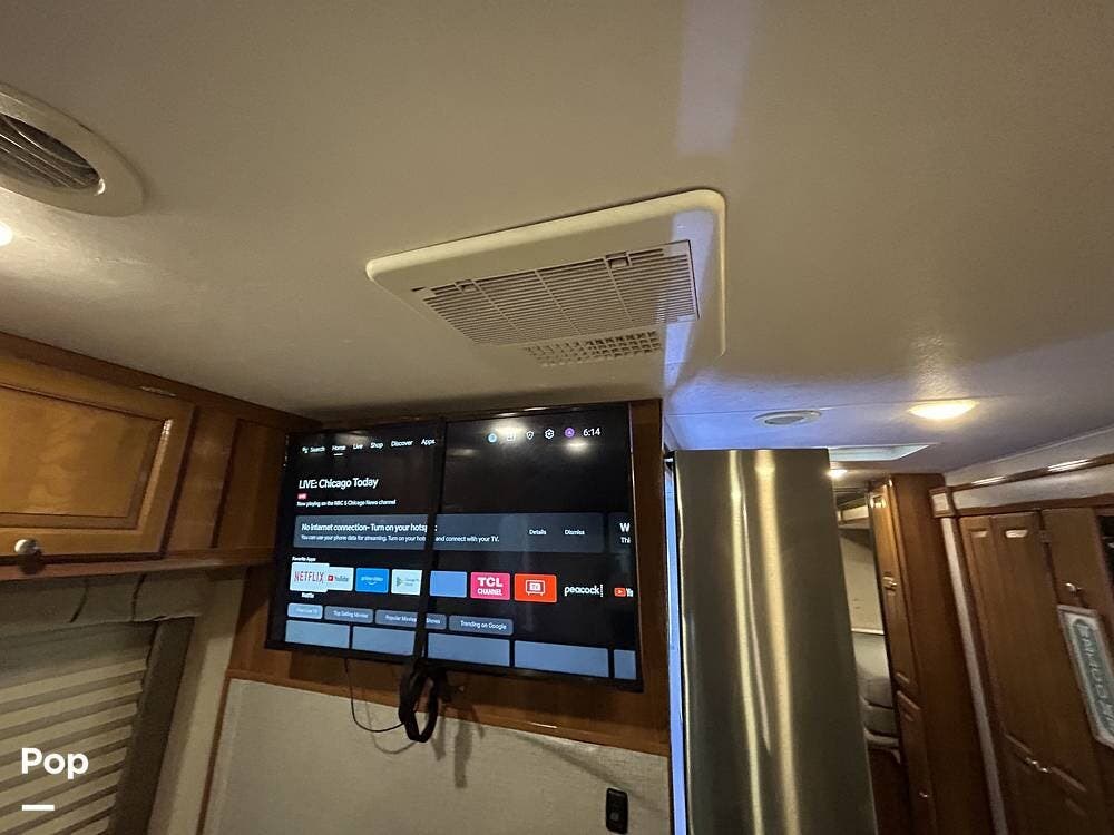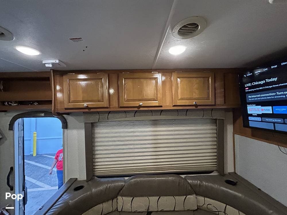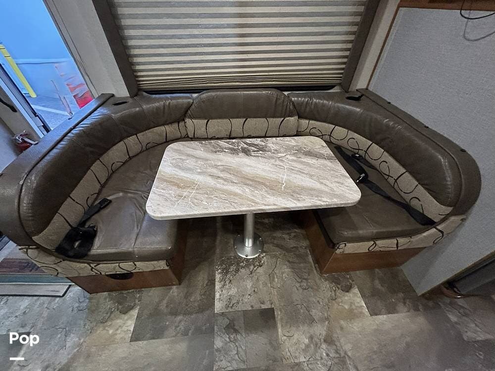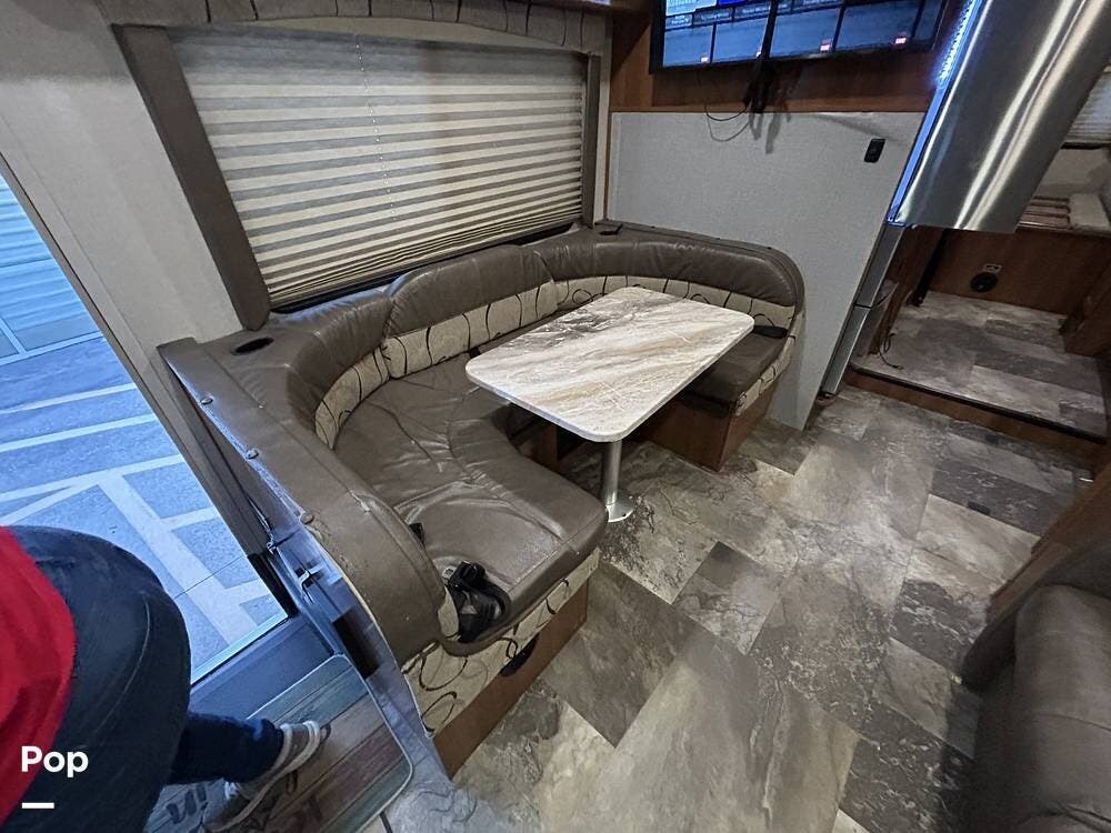 The coach features two slide-outs, including a large living area slide and a smaller bedroom slide, which really open up the interior and create a spacious feel. The living area includes a sleeper sofa and a U-shaped dinette positioned across from the entertainment center with a TV mounted on the interior wall.
