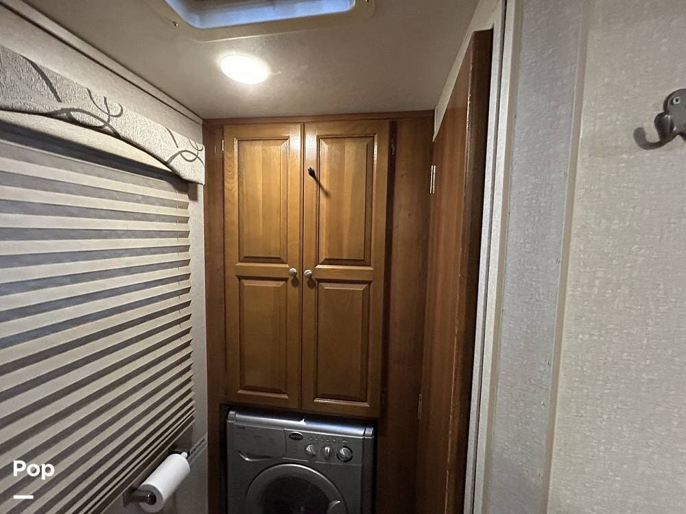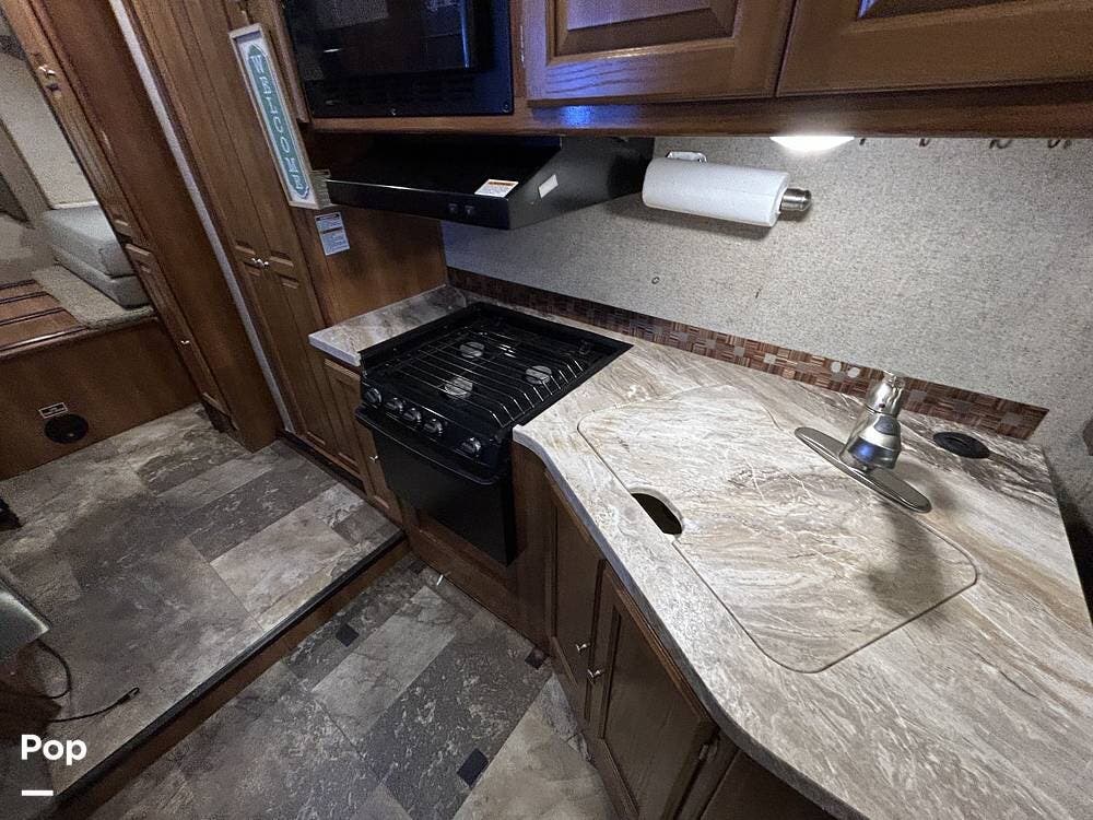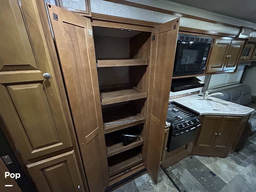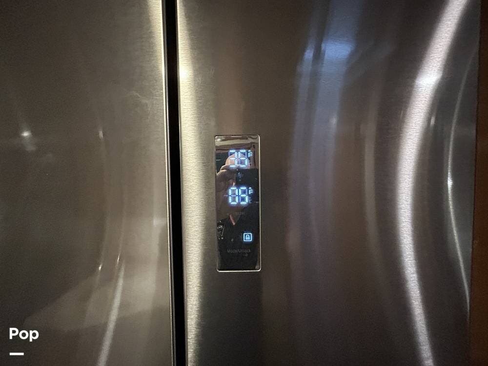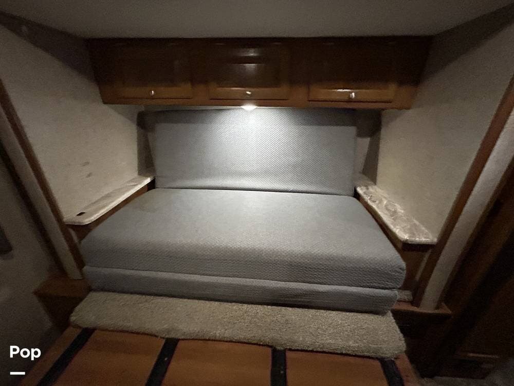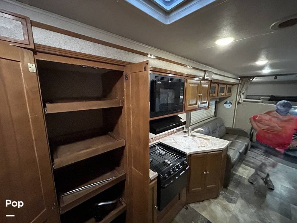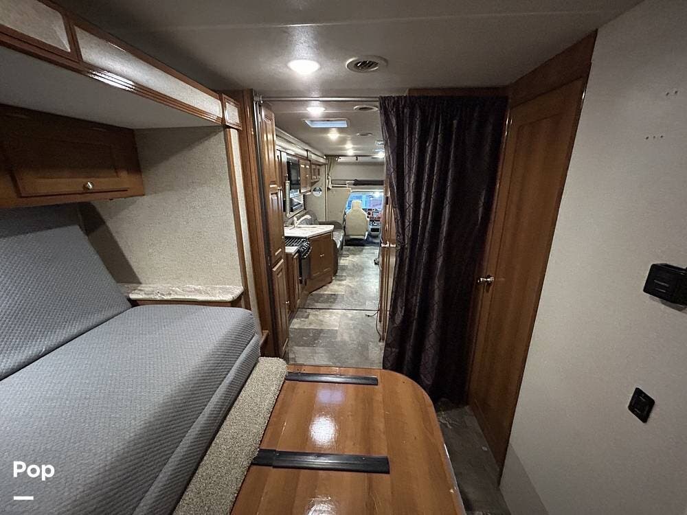 The kitchen offers plenty of space for cooking and includes a stove and oven combination, microwave, and a refrigerator/freezer. In the rear of the coach, the private bedroom features a comfortable queen-size bed, while the cab-over bunk provides additional sleeping space for guests or family.
