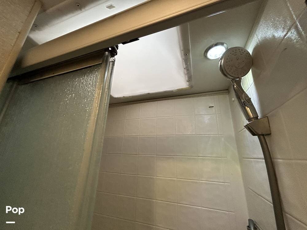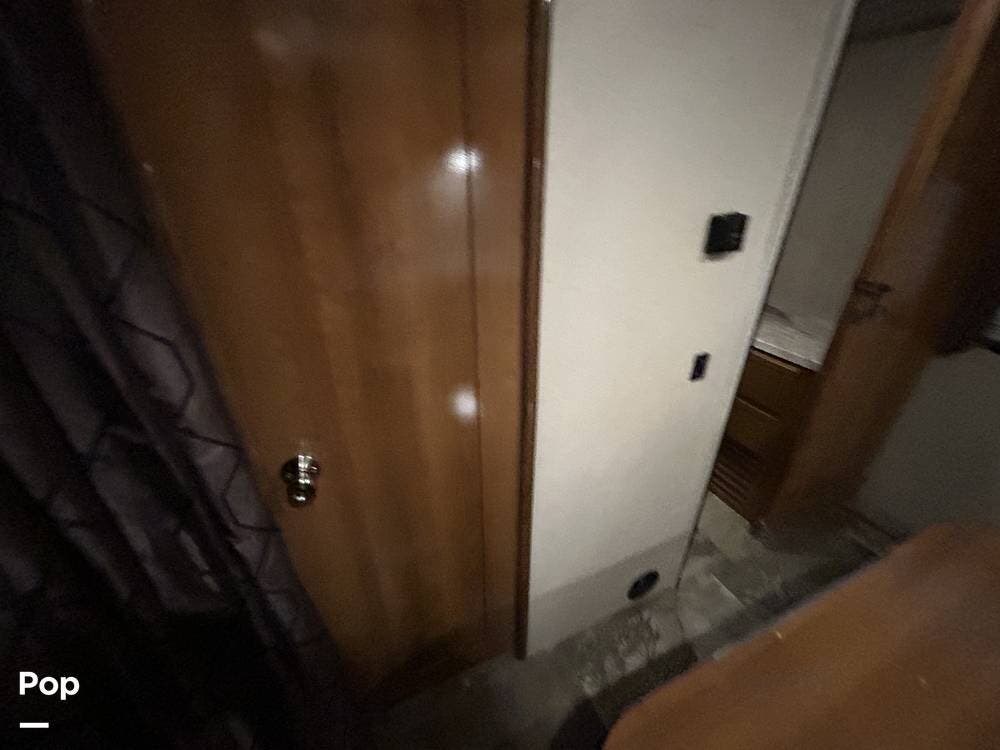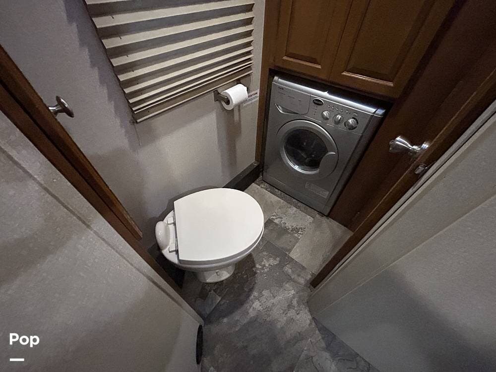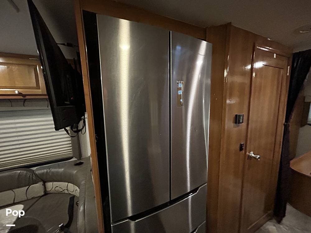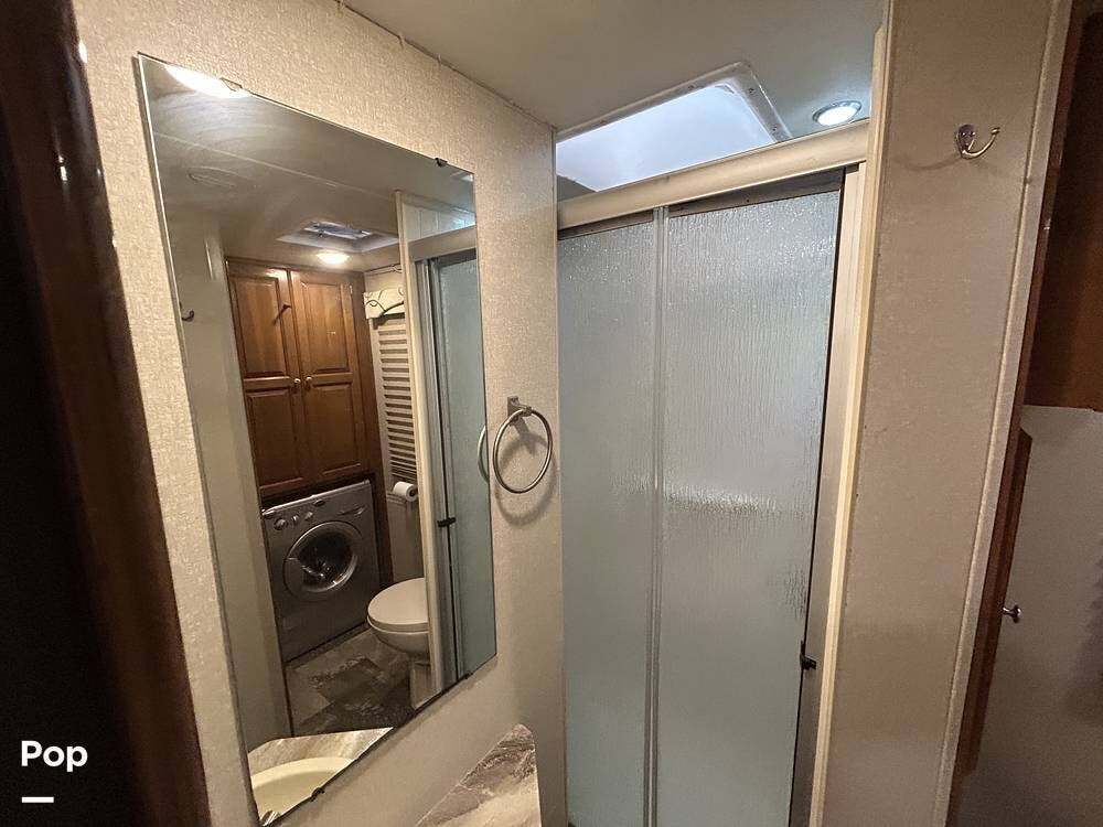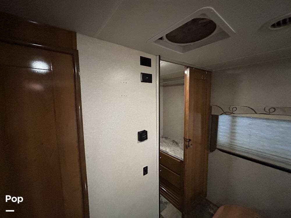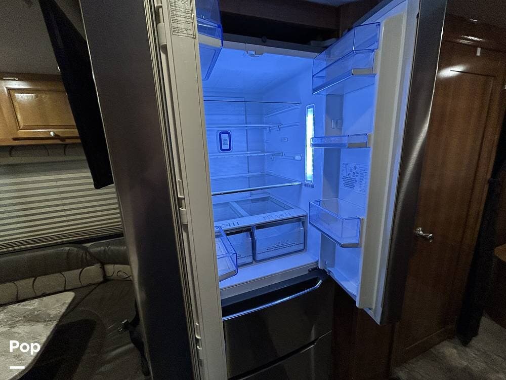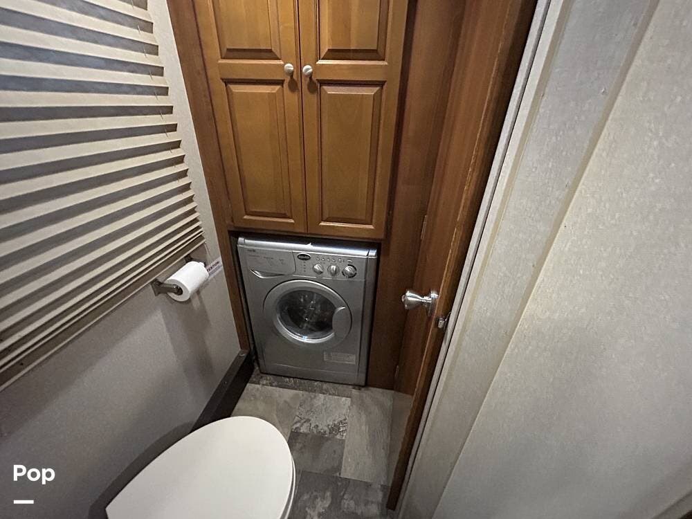 The kitchen offers plenty of space for cooking and includes a stove and oven combination, microwave, and a refrigerator/freezer. In the rear of the coach, the private bedroom features a comfortable queen-size bed, while the cab-over bunk provides additional sleeping space for guests or family.