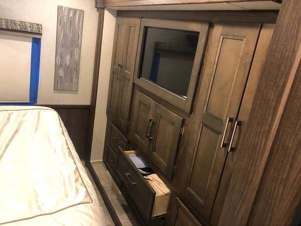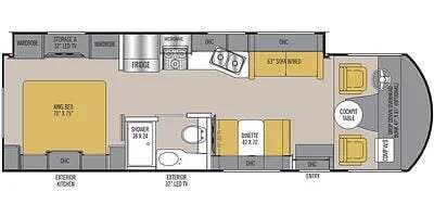 It features a full-wall slide on the driver's side for extra living space, a private rear king-size bed bedroom, and a fully equipped exterior kitchen with sink and fridge -- ideal for outdoor living. A power patio awning and outside TV add to the comfort for relaxing or entertaining outdoors.