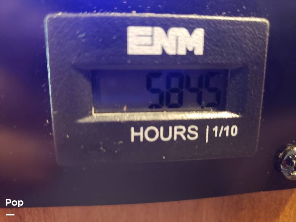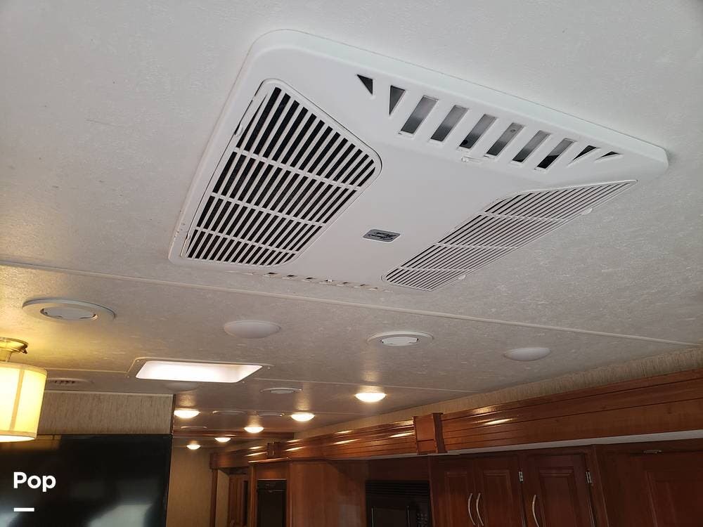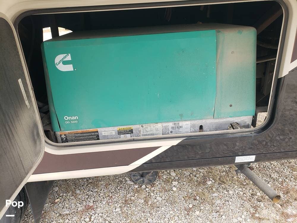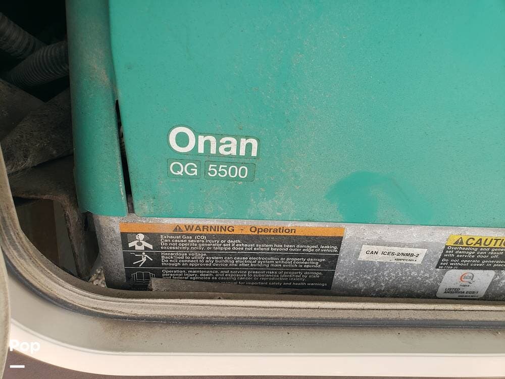 Outside, there is a patio awning, an outdoor kitchen, a roof ladder, storage, and an Onan QG 5500 gas engine with 585 hours.
