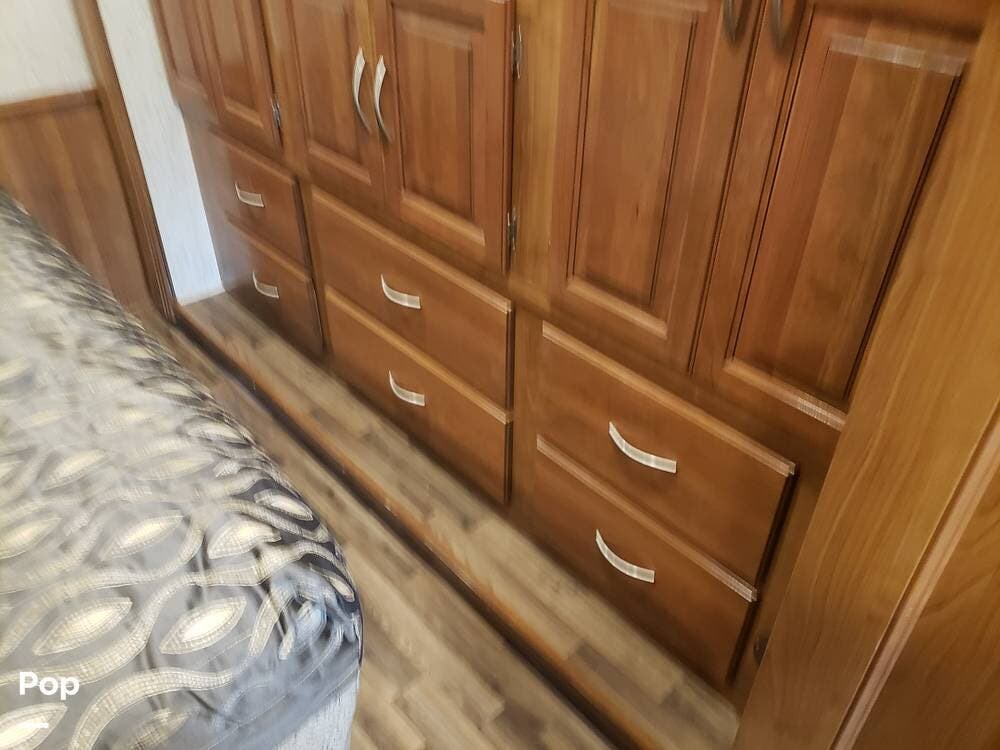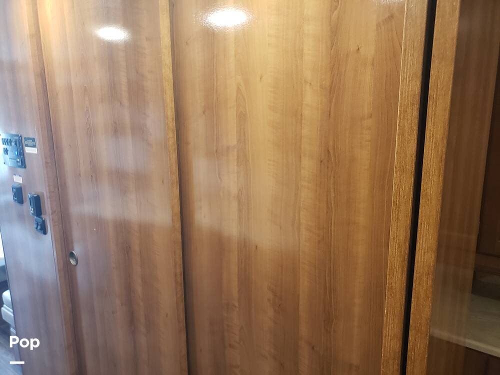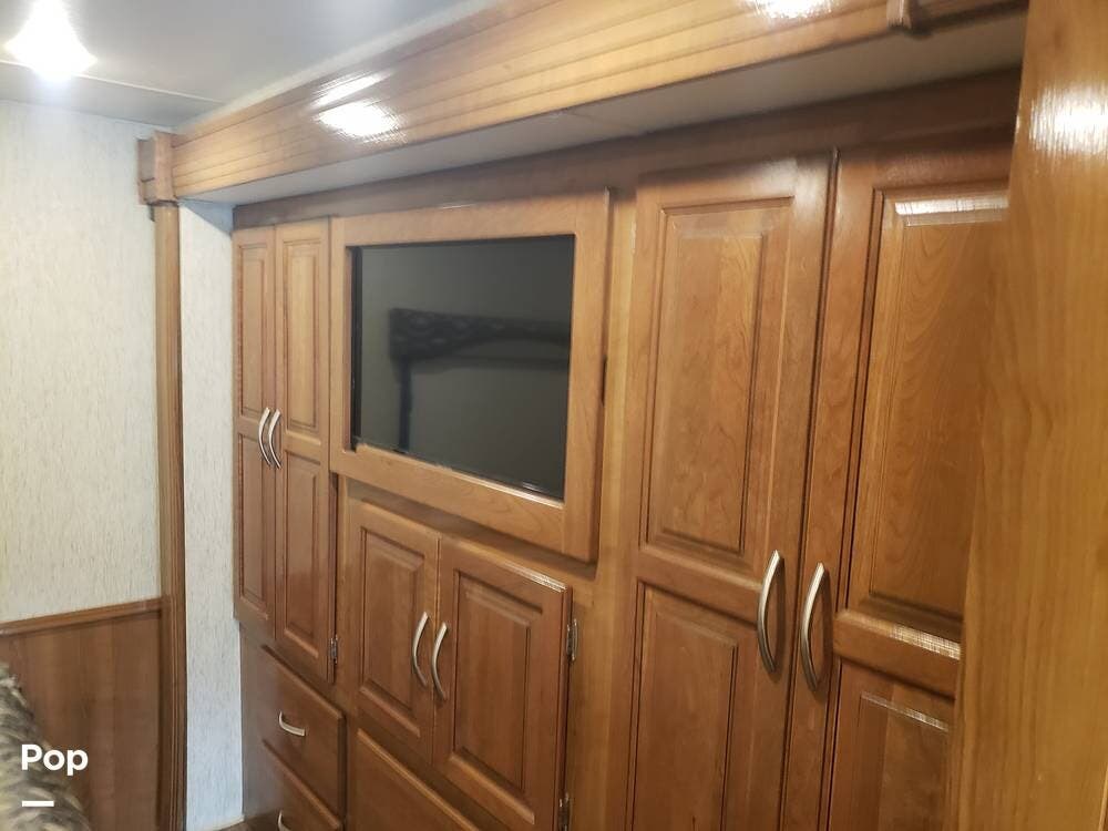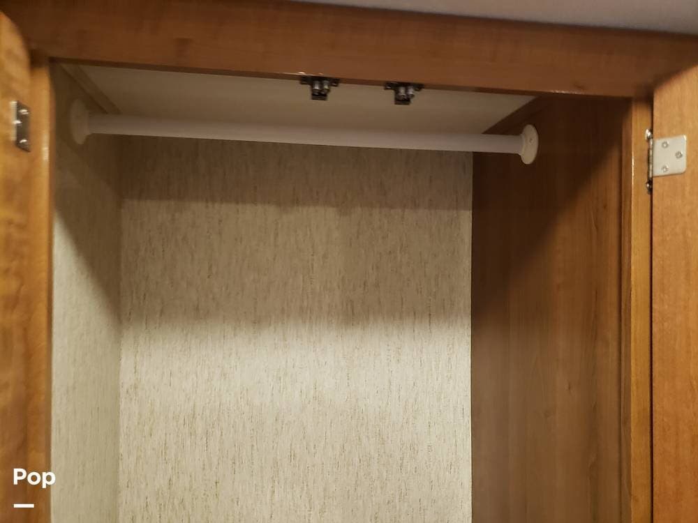 The rear suite has a pocket door for privacy, a king-sized bed that lifts up for storage, a flat screen TV, and cabinets with a wardrobe.