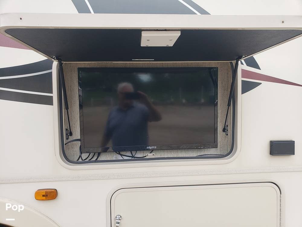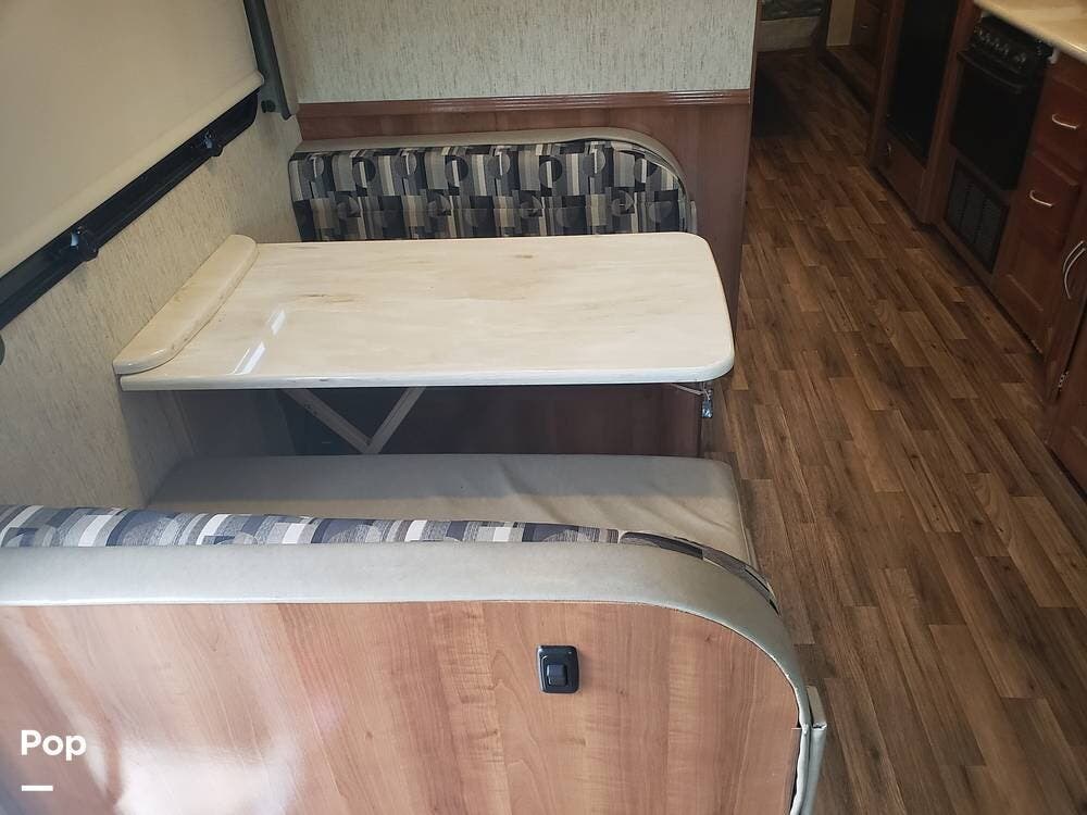 There is a sleeper sofa in the living area, and a drop-down dinette that makes an additional bed. A flat screen TV is wall-mounted.